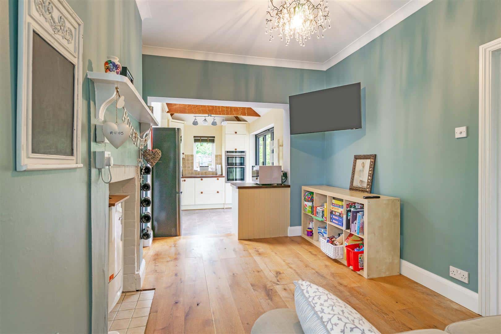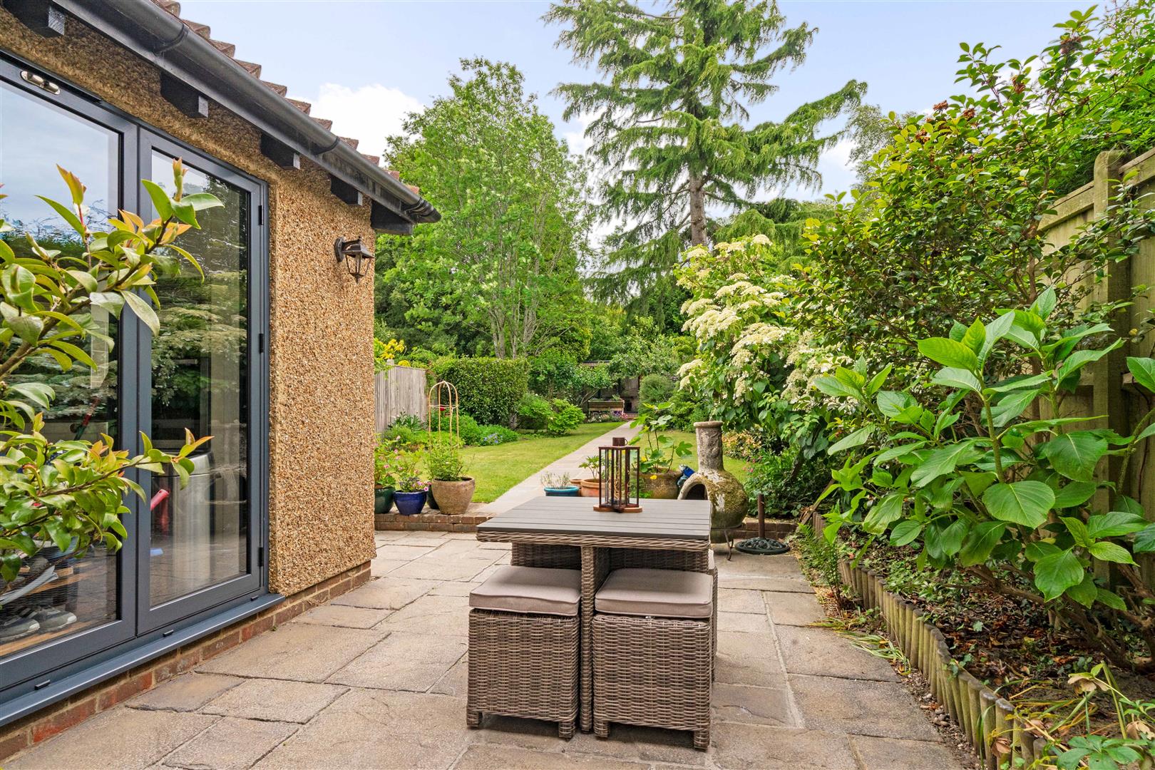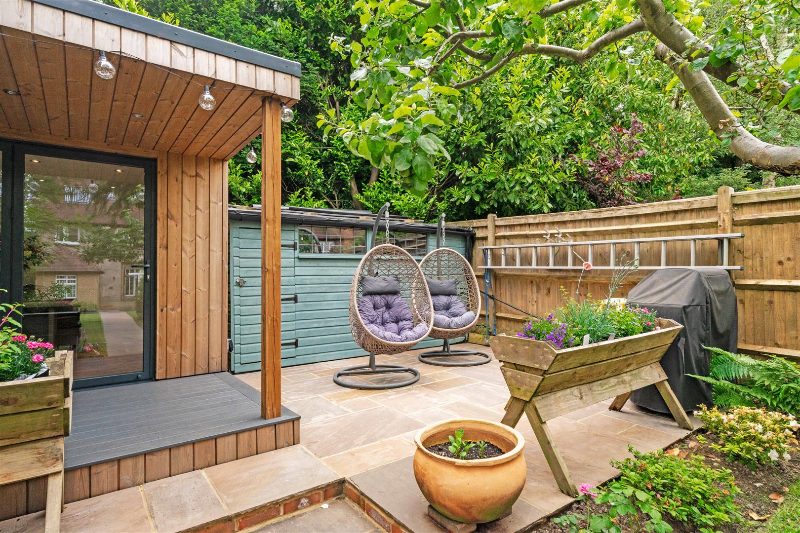 Outside, there is an attractively landscaped front garden and a generous, private rear garden with a substantial garden pod, currently used as an additional reception space, offering excellent versatility.