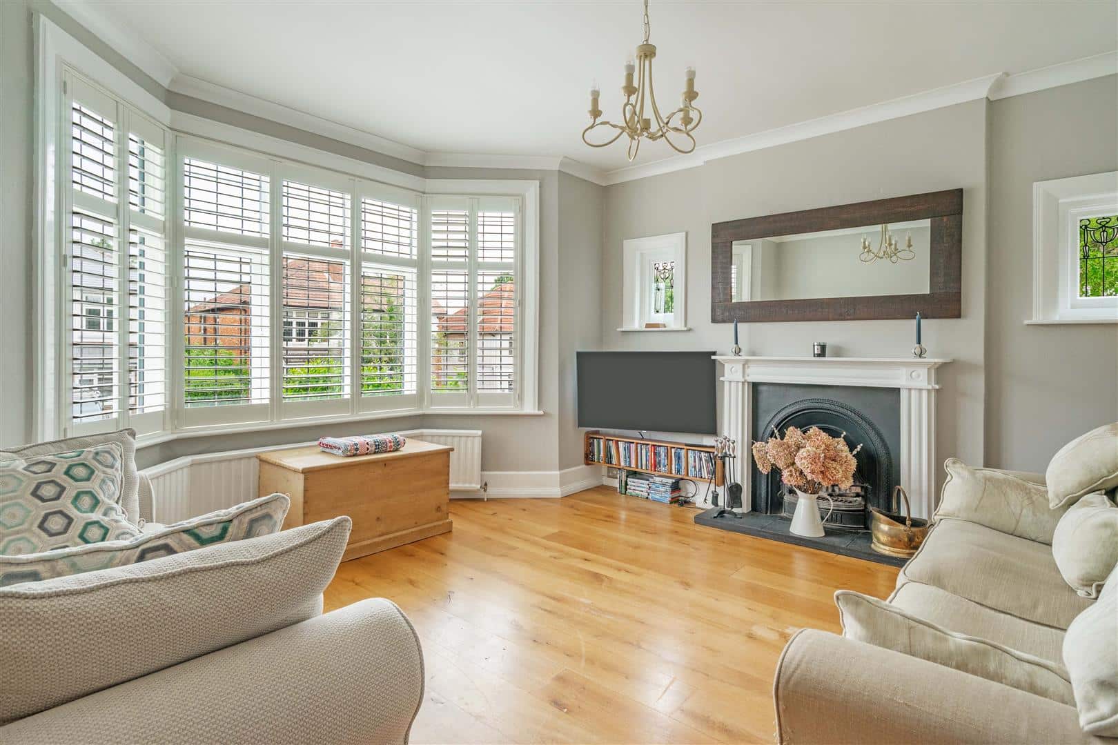 The ground floor comprises a welcoming entrance hall with wood flooring, a stylish shower room, a bright dual aspect living room with bay windows, plantation shutters and feature wrought iron fireplace, a separate dining room with French doors to the garden, and a family room opening into the kitchen to create a superb open plan living space.