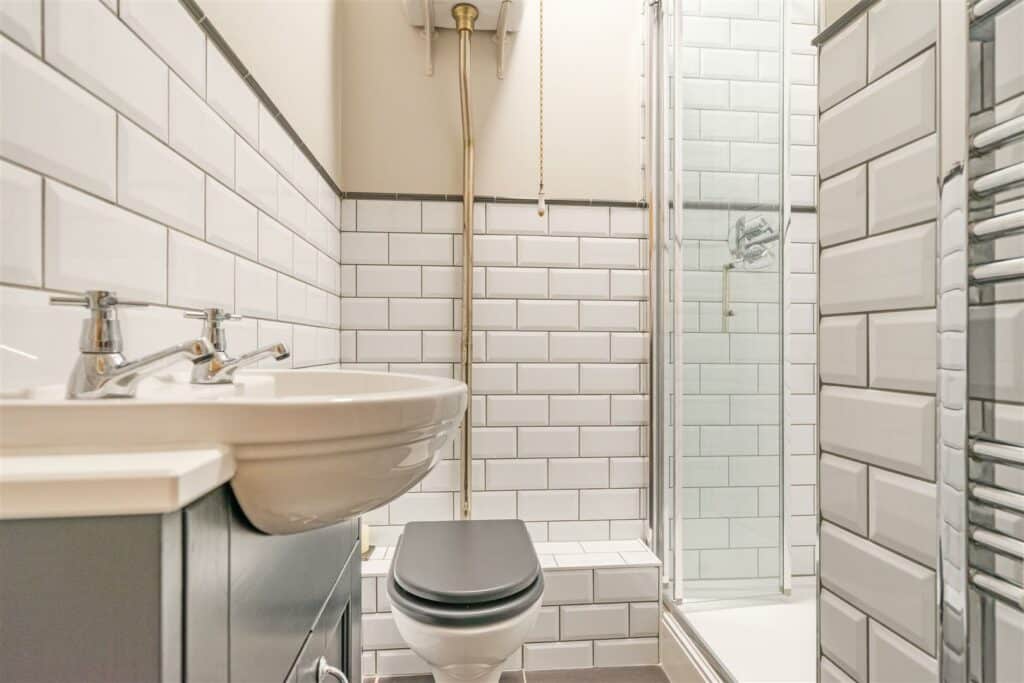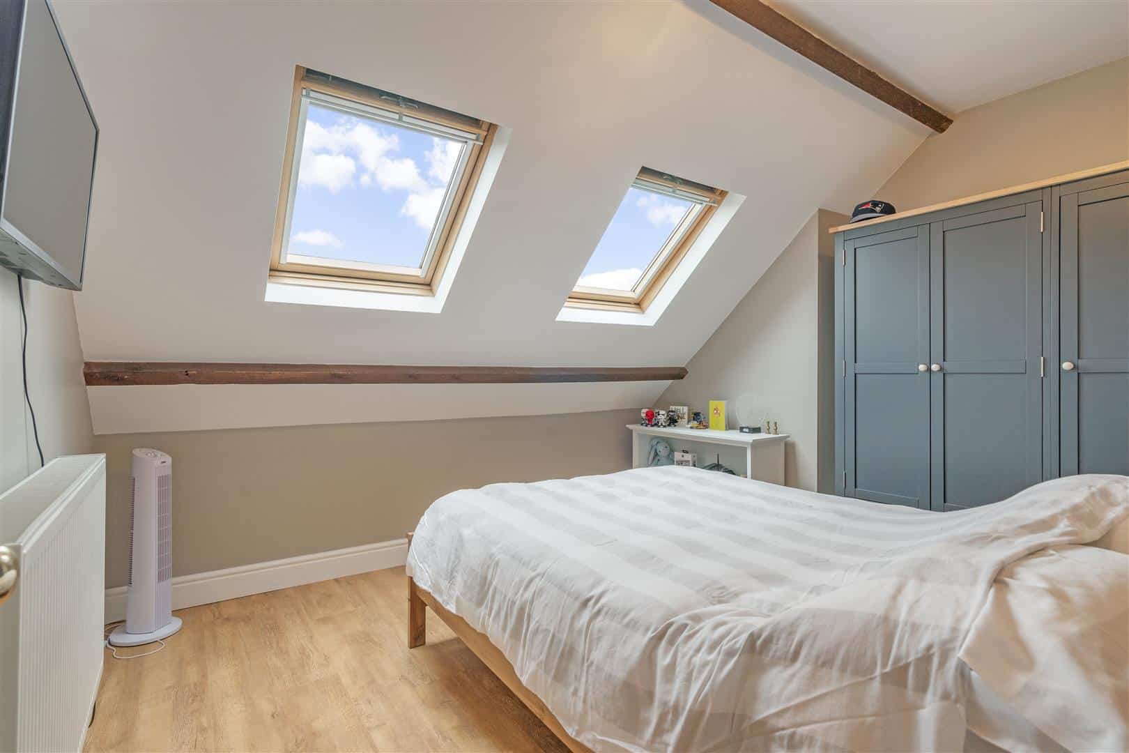 The kitchen is modern and well appointed, enjoying bi fold doors and a vaulted beamed ceiling with Velux window, and is fitted with shaker style units, quality integrated appliances and ample work surfaces. A separate utility room provides additional practicality.