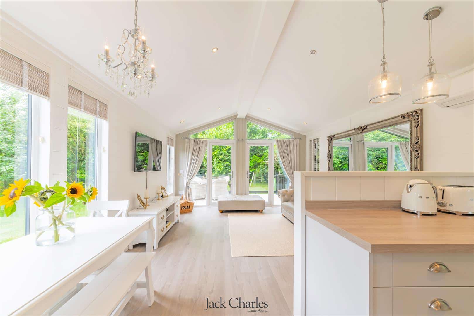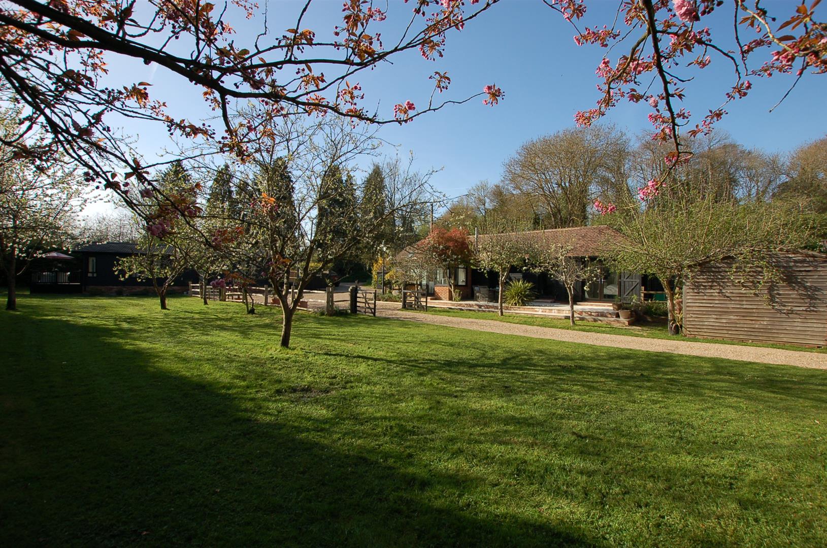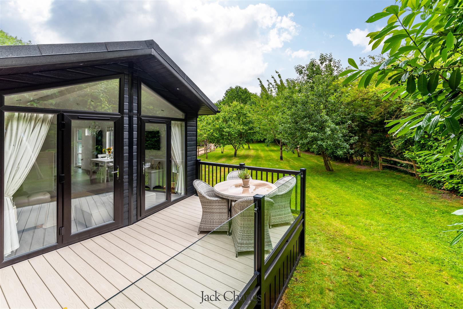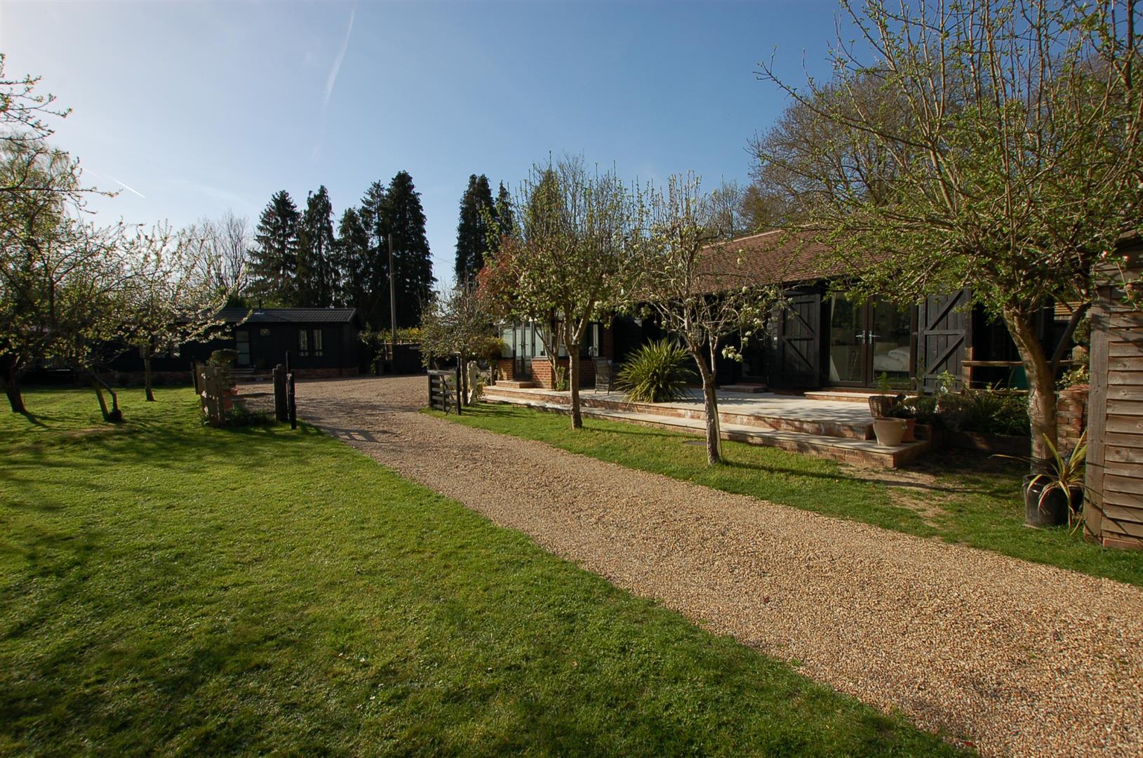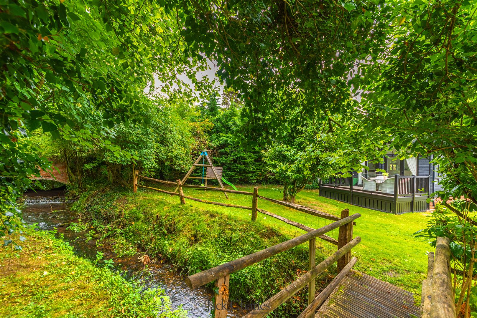 The gardens are predominantly laid to lawn with variety of mature trees, it is bordered by a stream with a little bridge that crosses over to a small secluded area of garden near to the bridge. The detached park lodge stands to the right as you enter, and is to one side of the gardens and is very much in keeping with the barn and internally is stunning. There are steps to the entrance door and a hallway which gives access to 2 bedrooms and a bathroom as well as a stunning open plan family room / kitchen that has a triple aspect with windows to front side and rear, the side elevation has wonderful floor ceiling height glazed windows and doors leading out to a super decked balcony with glass panelling providing an unobscured view of the gardens Book a Viewing