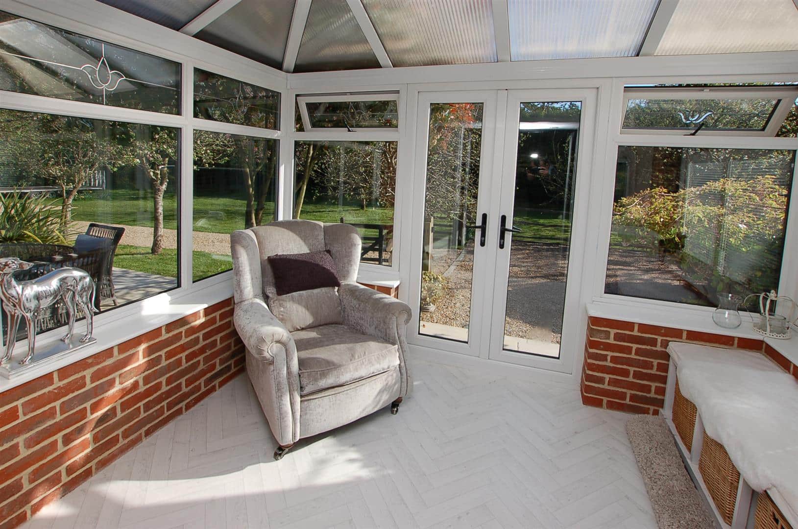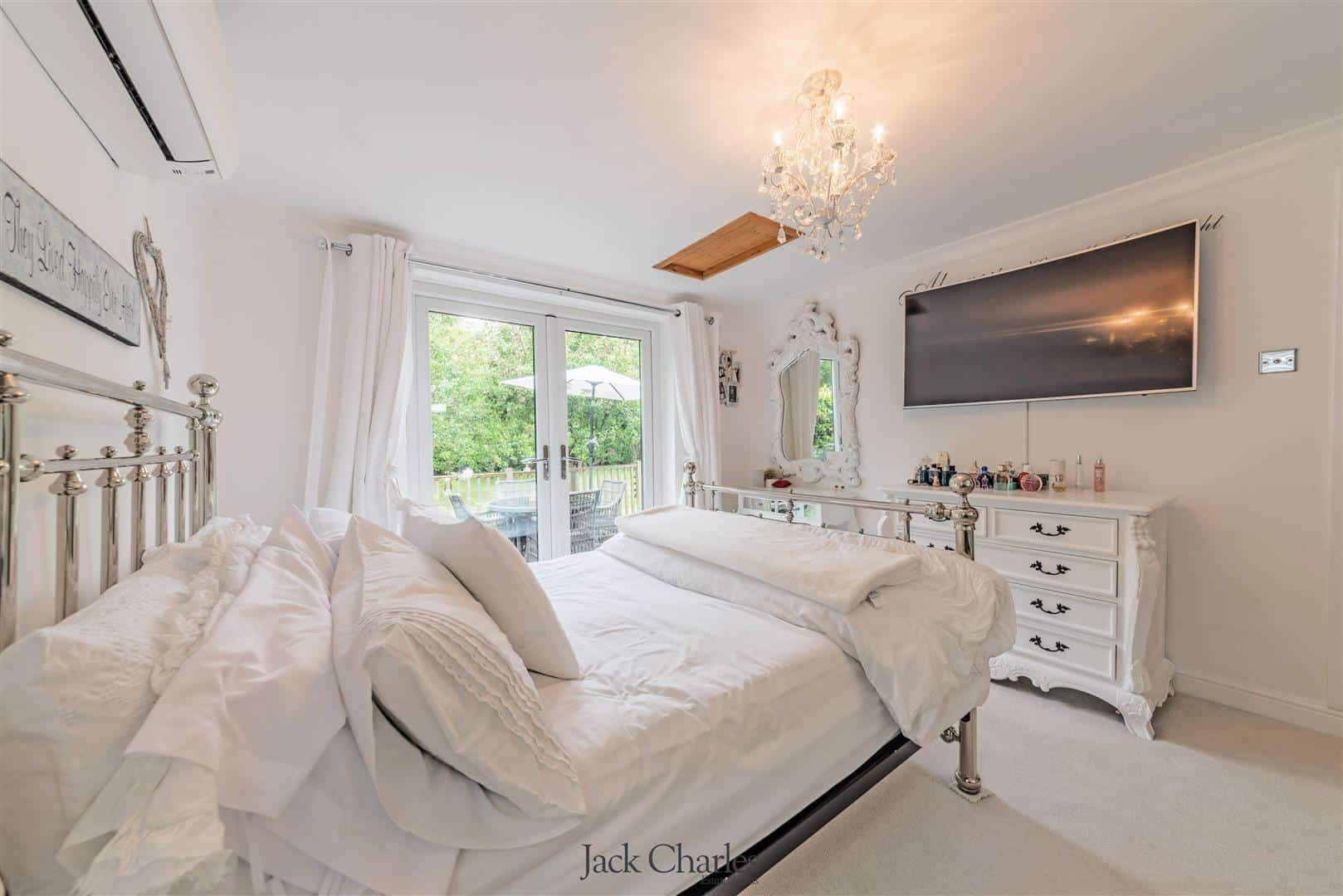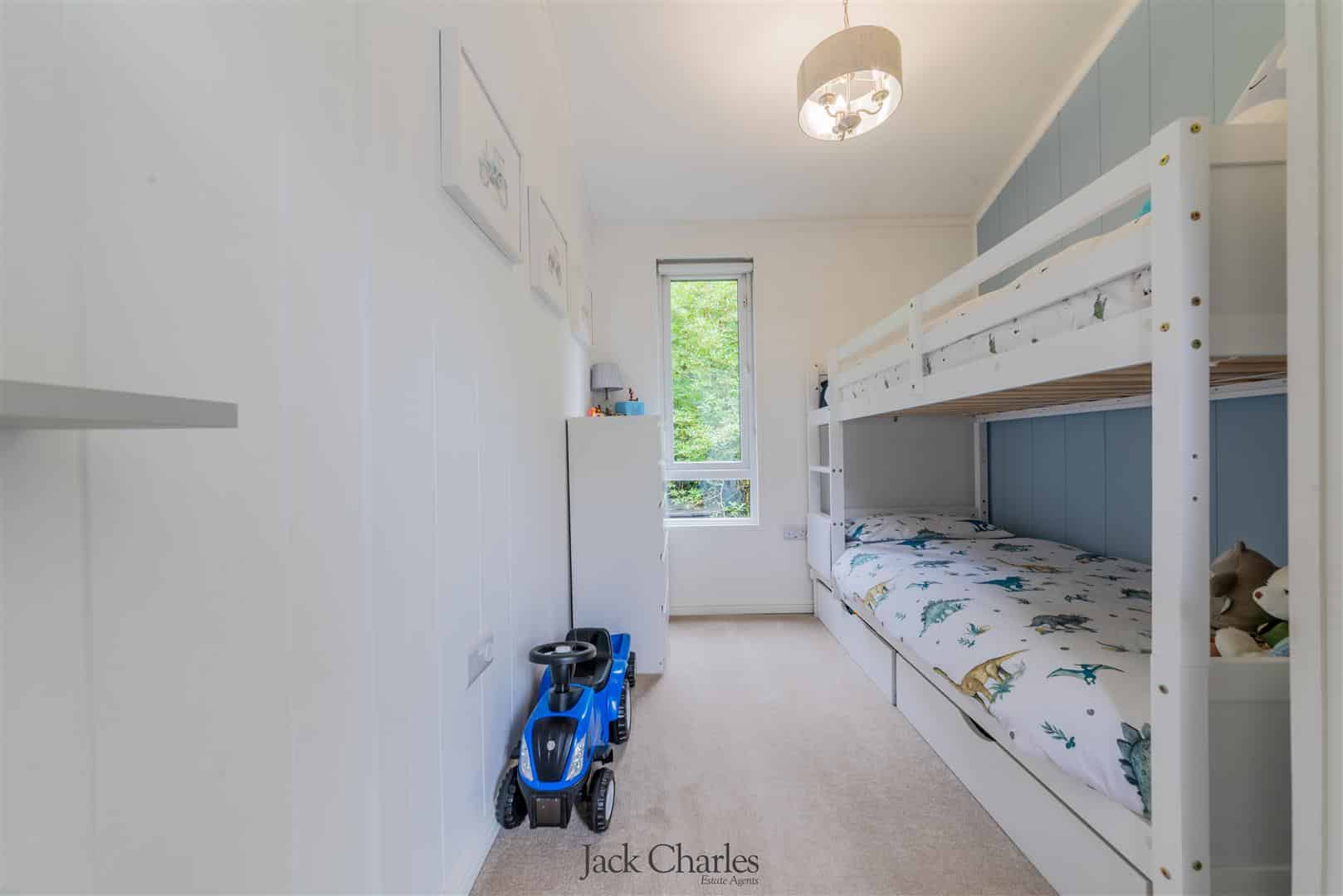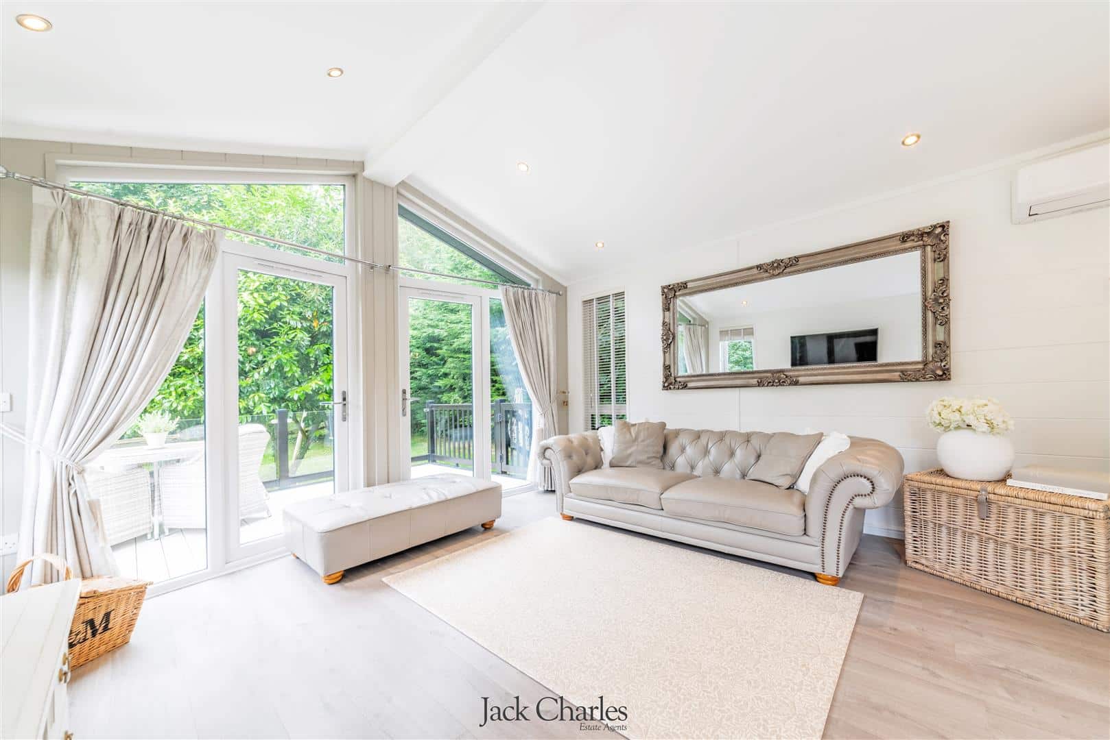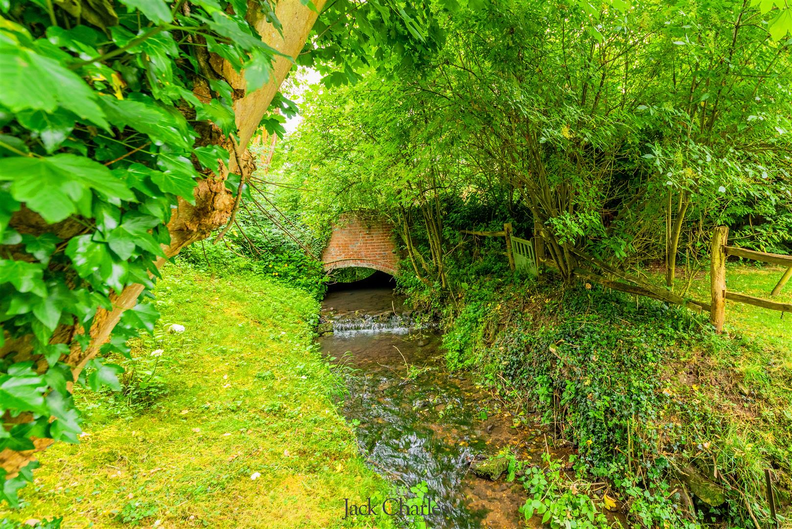 The gardens are predominantly laid to lawn with variety of mature trees, it is bordered by a stream with a little bridge that crosses over to a small secluded area of garden near to the bridge. The detached park lodge stands to the right as you enter, and is to one side of the gardens and is very much in keeping with the barn and internally is stunning. There are steps to the entrance door and a hallway which gives access to 2 bedrooms and a bathroom as well as a stunning open plan family room / kitchen that has a triple aspect with windows to front side and rear, the side elevation has wonderful floor ceiling height glazed windows and doors leading out to a super decked balcony with glass panelling providing an unobscured view of the gardens Book a Viewing
