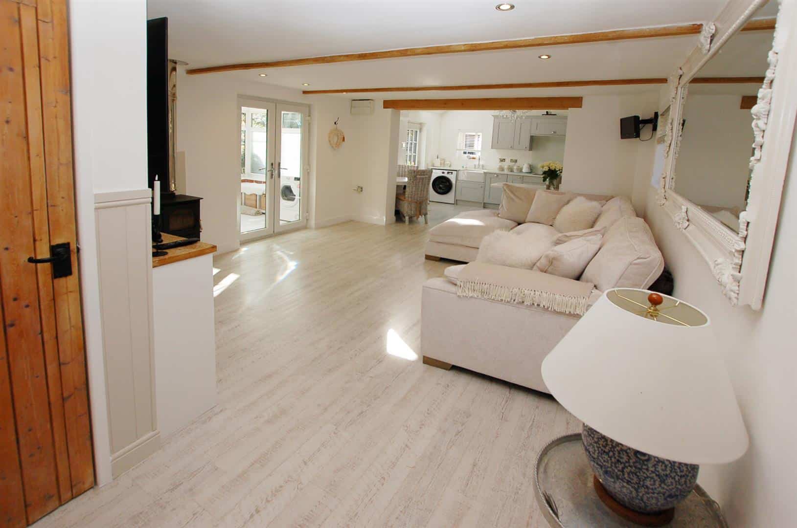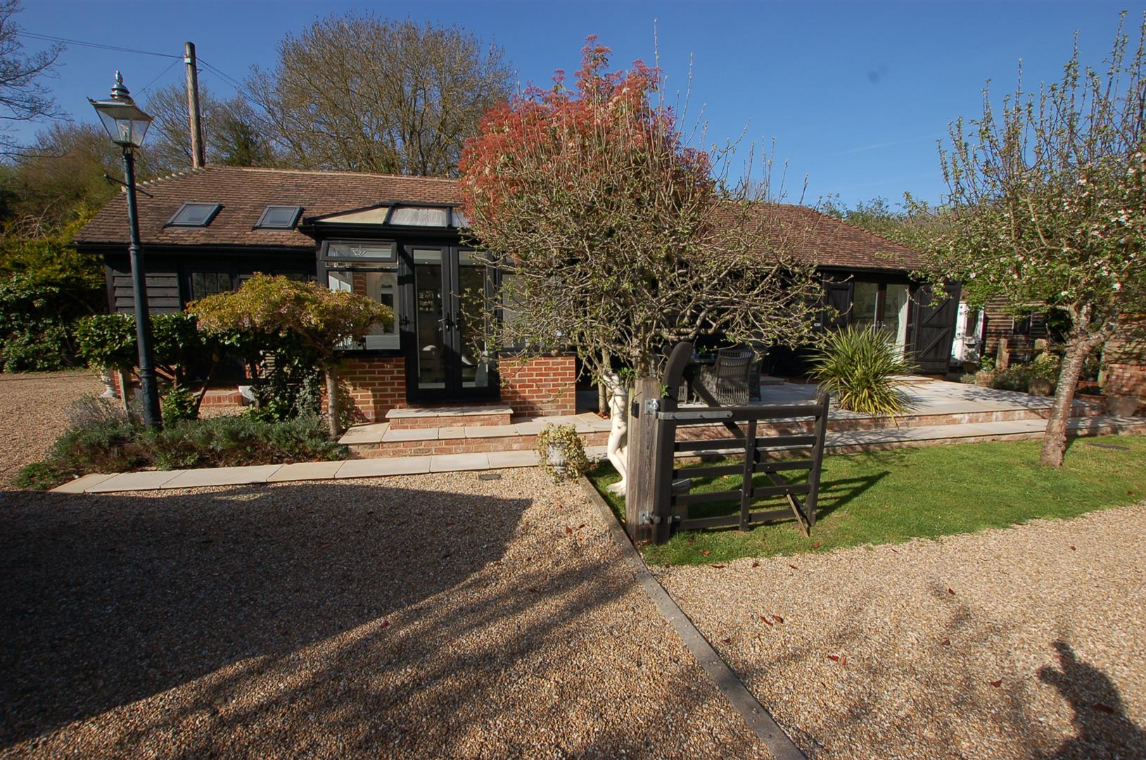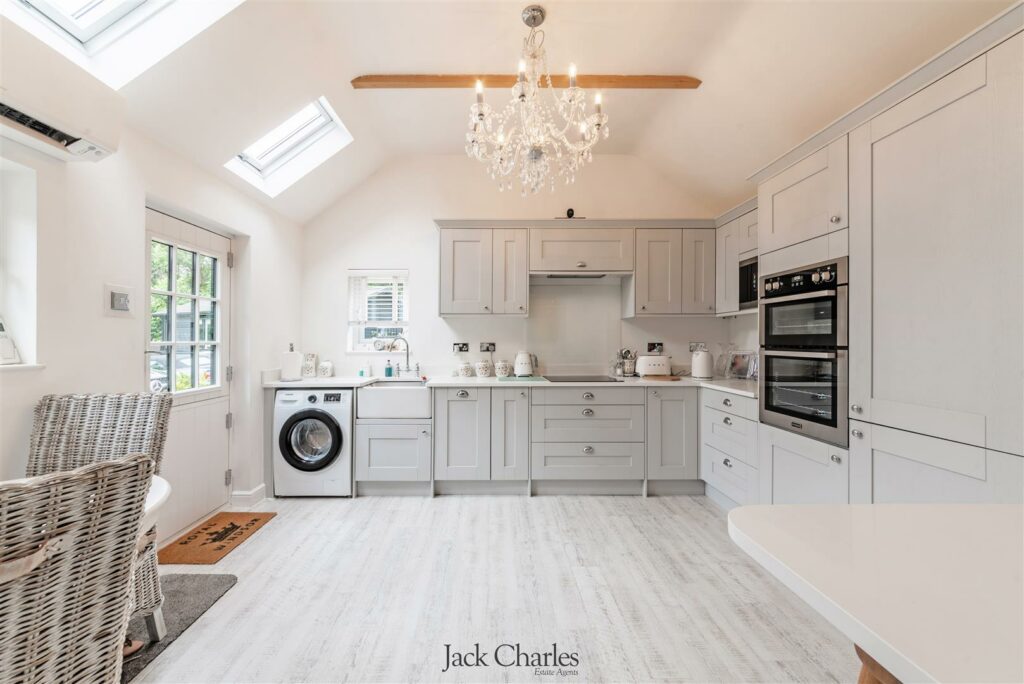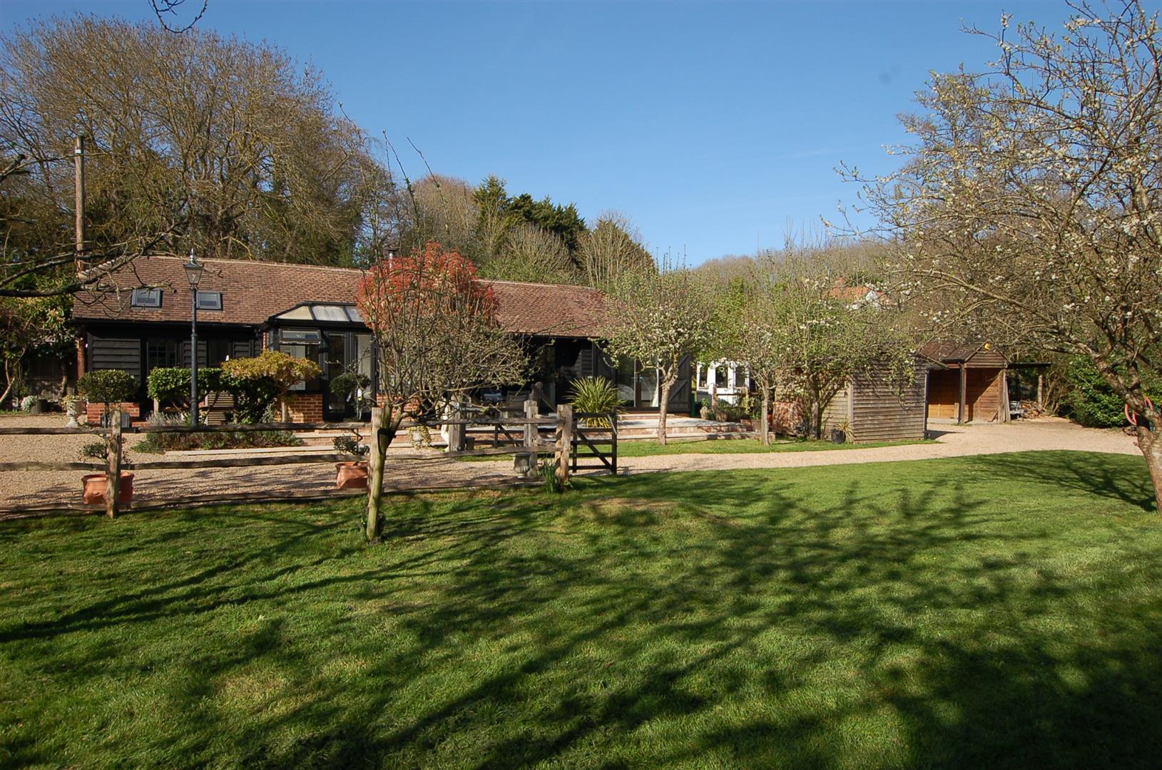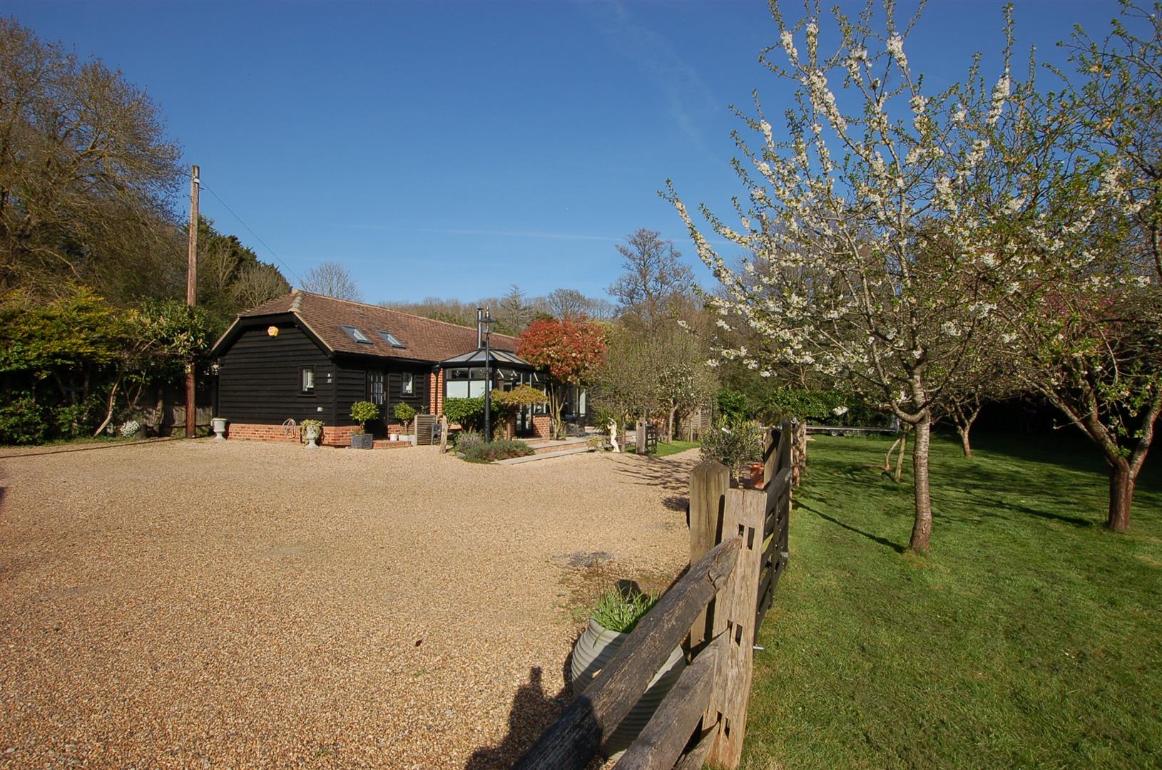 You approached through wrought iron gates over a gravel driveway which provides parking for several vehicles, the driveway. The Barn is to the left as you enter and is of brick construction with wood clad weatherboarding. The entrance door leads into a stunning kitchen / breakfast room which has a range of units incorporating cupboards and drawers, a breakfast bar and there is space for table and chairs, The kitchen is open plan with the living room which has double doors to a conservatory overlooking the front garden as well as a door to the rear via the inner hallway which also leads to 2 bedrooms and a shower room.