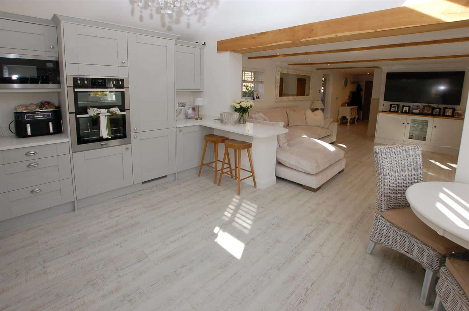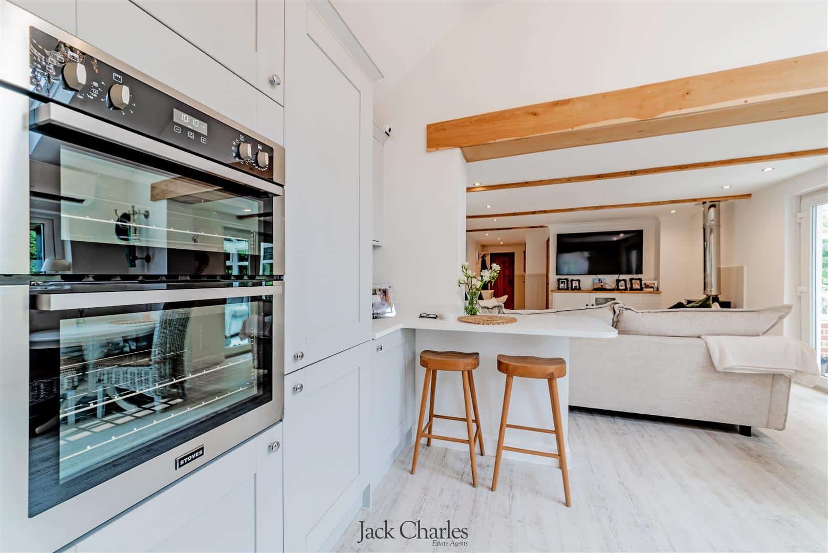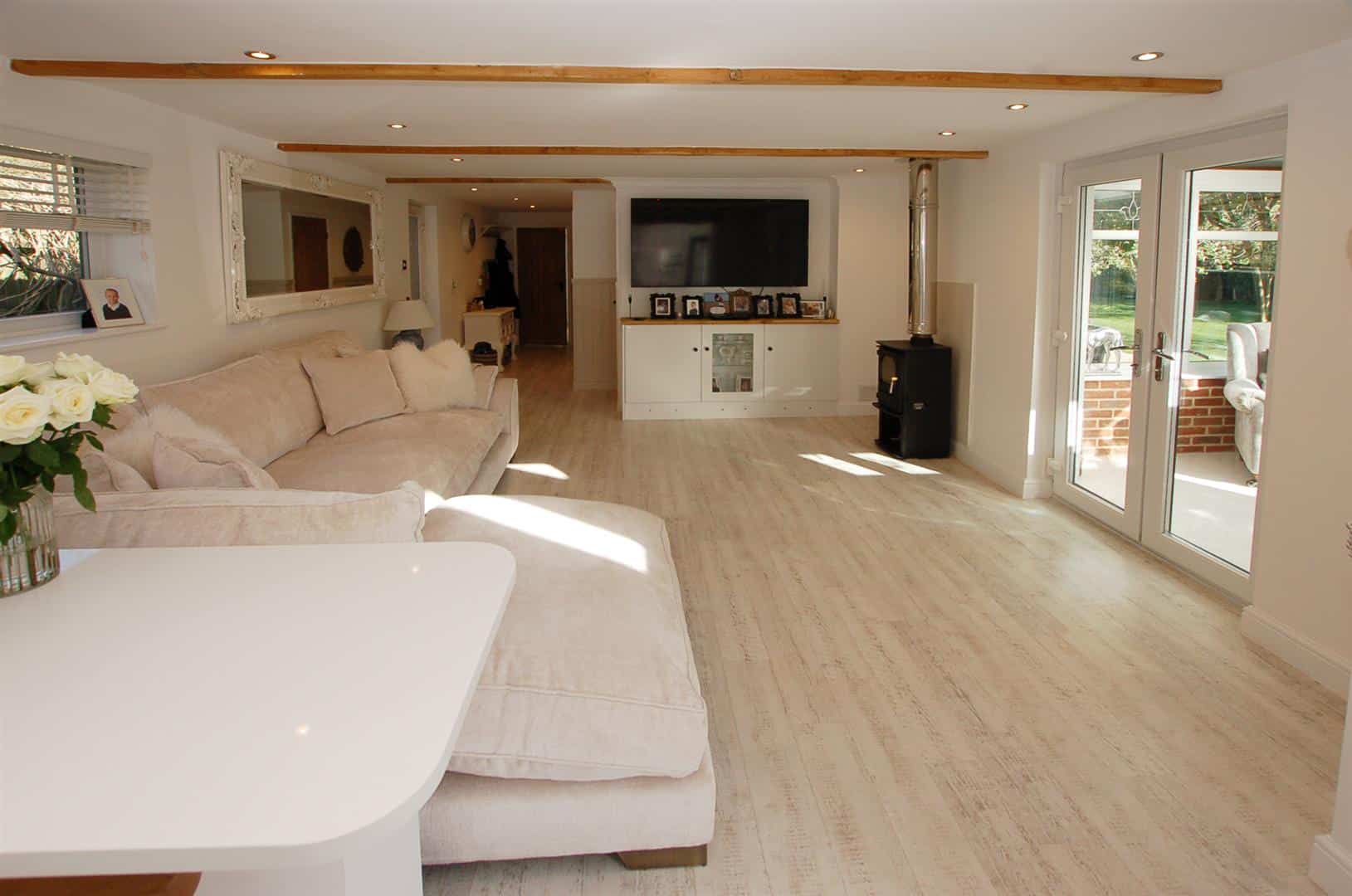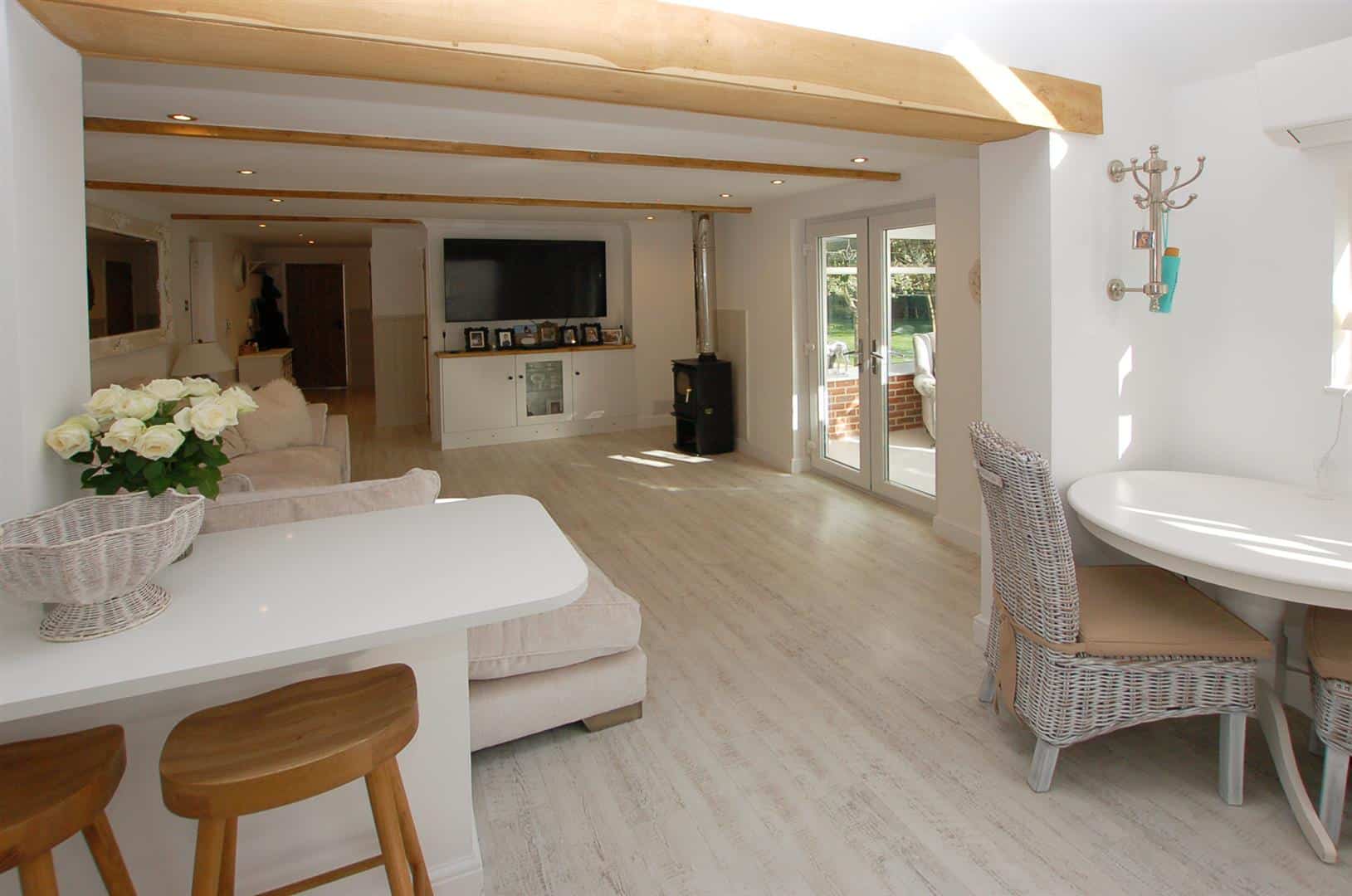 You approached through wrought iron gates over a gravel driveway which provides parking for several vehicles, the driveway. The Barn is to the left as you enter and is of brick construction with wood clad weatherboarding. The entrance door leads into a stunning kitchen / breakfast room which has a range of units incorporating cupboards and drawers, a breakfast bar and there is space for table and chairs, The kitchen is open plan with the living room which has double doors to a conservatory overlooking the front garden as well as a door to the rear via the inner hallway which also leads to 2 bedrooms and a shower room.