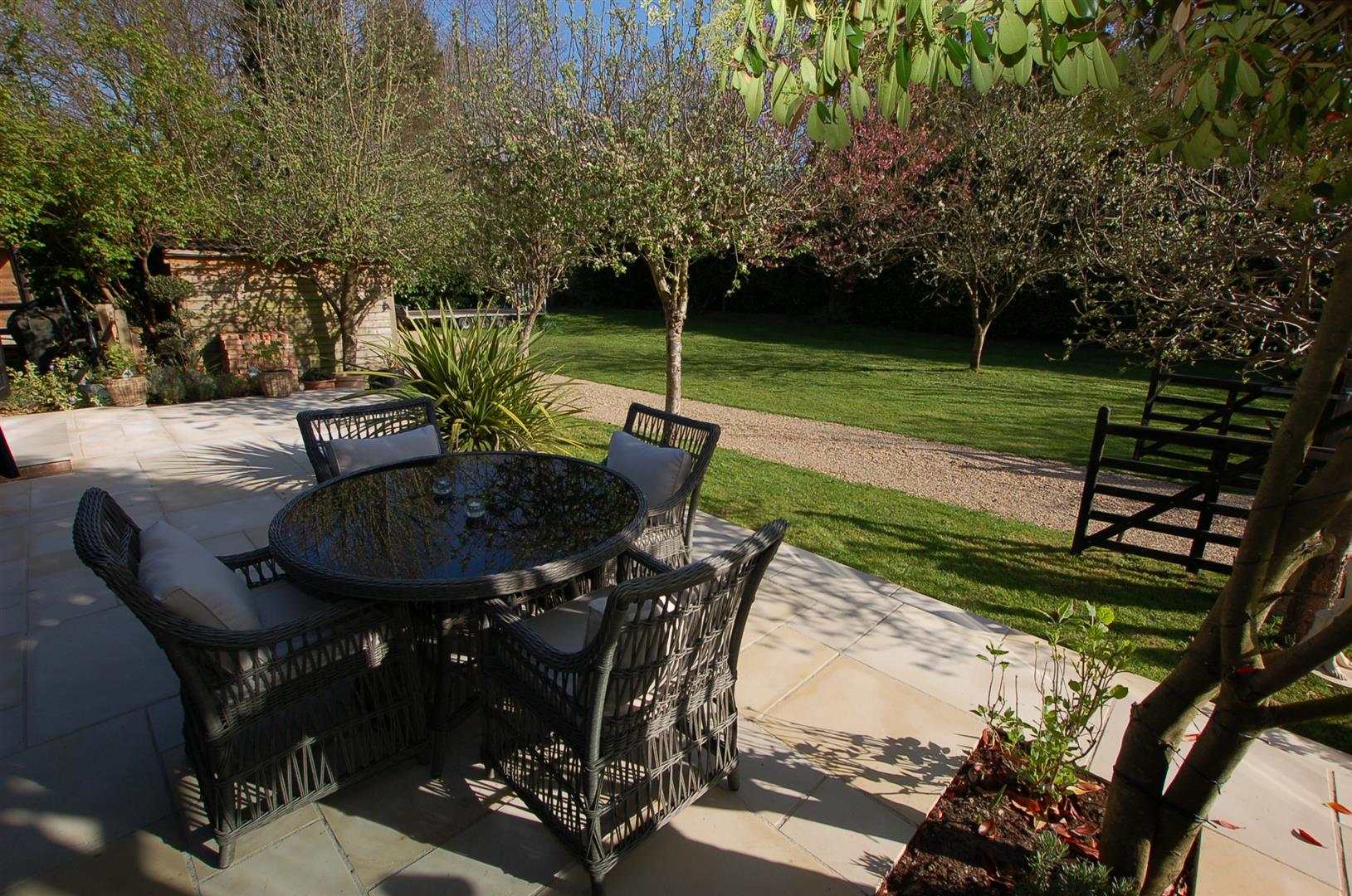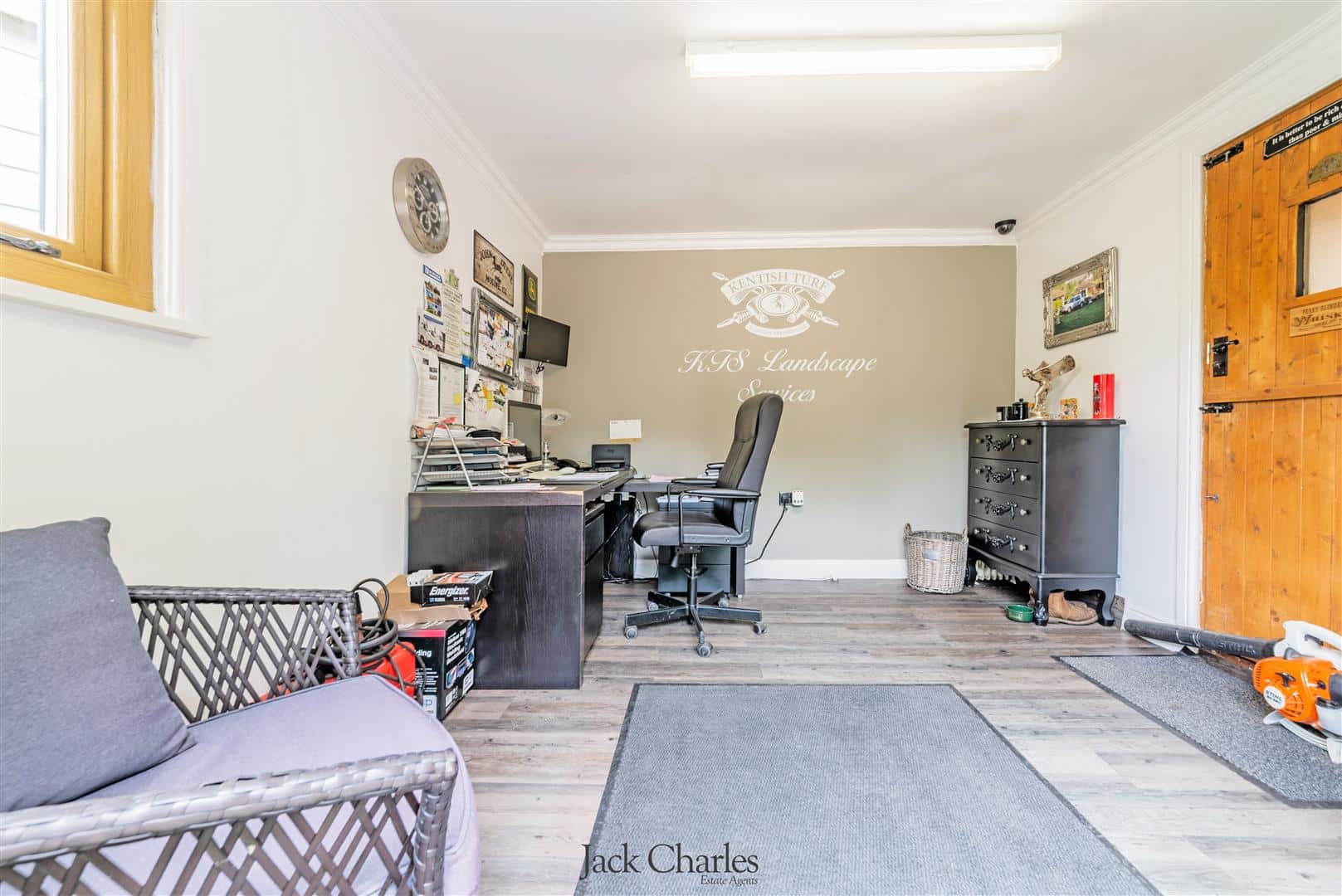 Outside there is a wonderful private decked area enclosed by wooden balustrades and turn spindles and offers a pleasant outlook over the gardens. There is a further area to the side which is enclosed and has a gate giving access to a home office which has power and light as well as and 3 timber open barns.