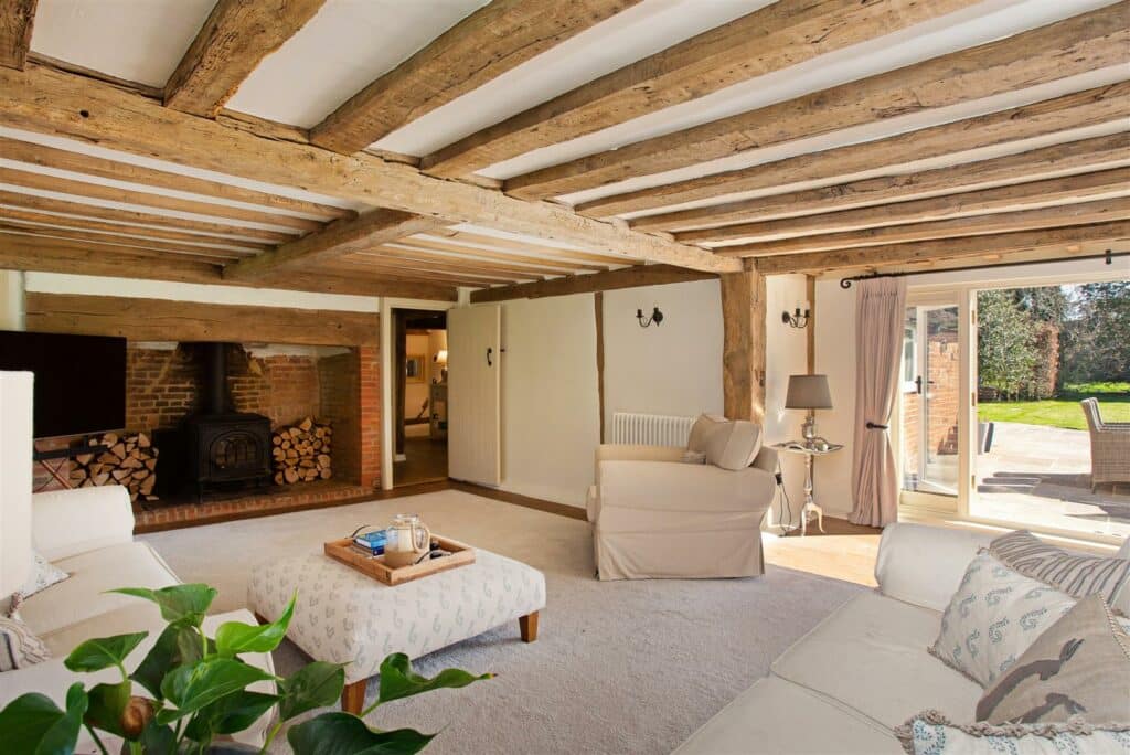 With over 3,000 square feet of thoughtfully refurbished living space, this home offers flexible accommodation across three floors, making it ideal for family living. The interior is tastefully presented, featuring a wealth of exposed oak beams and timbers, bespoke drop latch doors, and a combination of travertine and engineered wood flooring in various rooms. The ground floor comprises three reception rooms, including a charming dining room, a family room, and a lovely sitting room that benefits from a triple aspect and an inglenook fireplace, with doors leading directly to the garden.