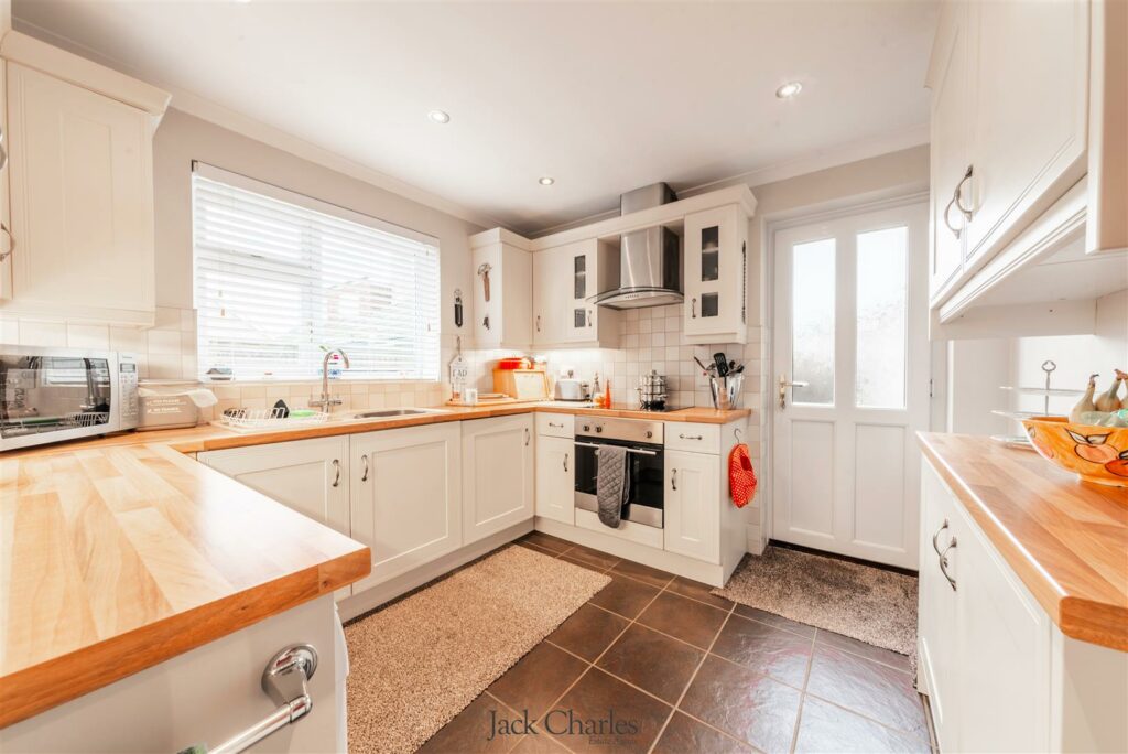 The kitchen is fitted with a range of cream base and eye level units incorporating a 1½ bowl sink unit, ceramic hob with extractor hood over and fitted cooker. Integrated appliances include a washing machine, fridge and Bosch dishwasher. A rear window and door provide direct access to the garden.