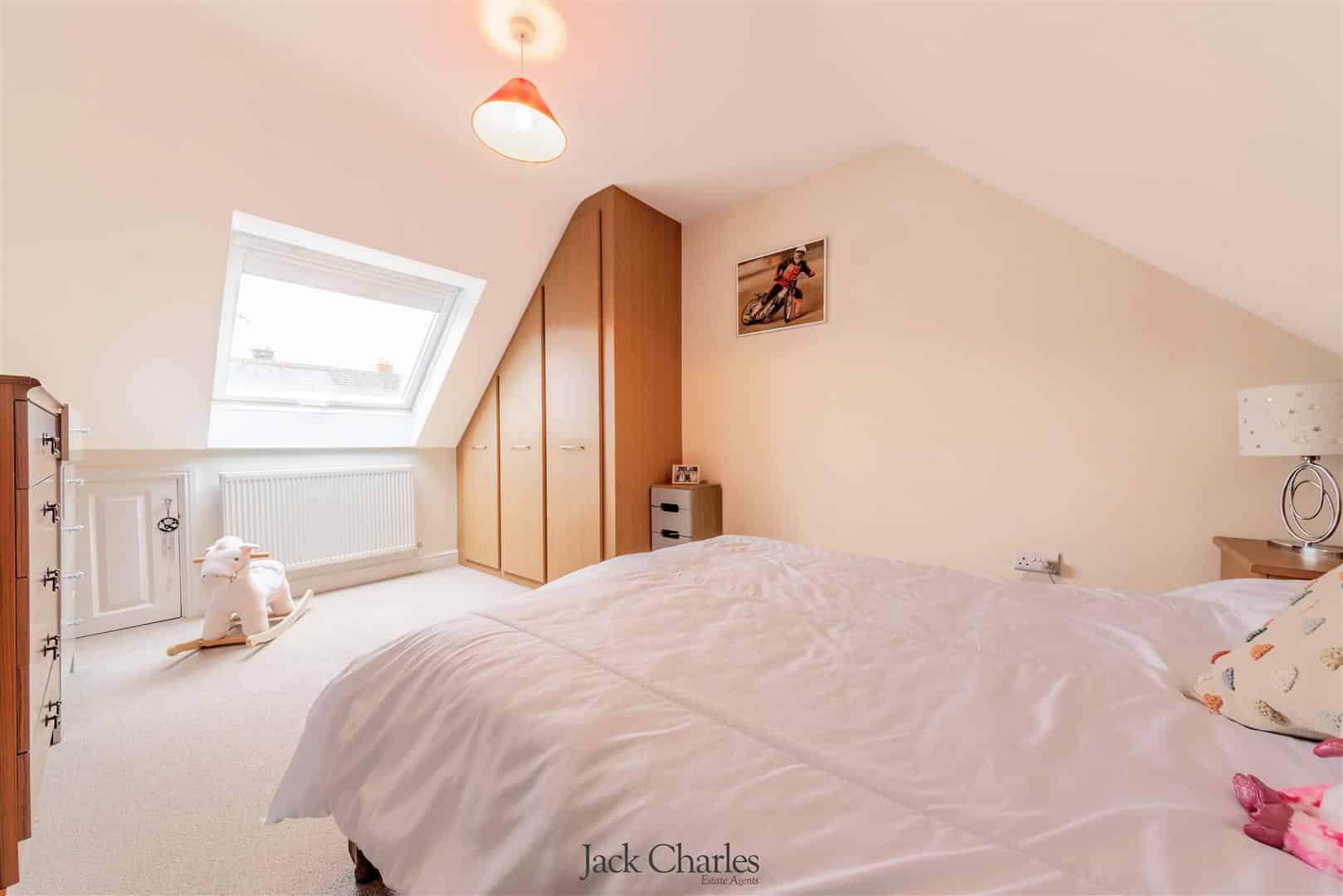 To the first floor, the landing offers useful storage. Bedroom one enjoys built in wardrobes and an ensuite shower room, while bedroom two features a Velux window, built in wardrobe and eaves storage.