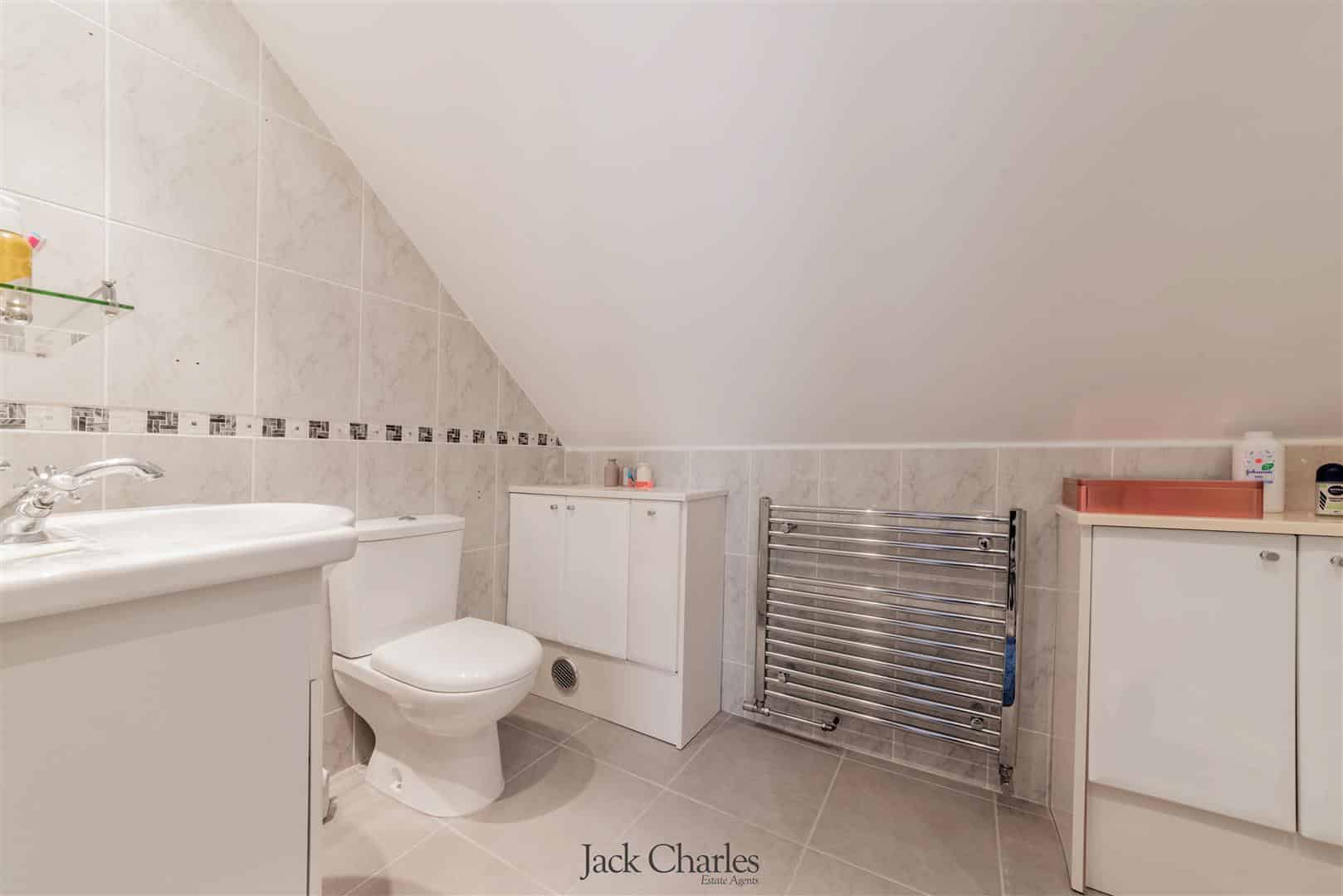 The main shower room is fitted with a shower cubicle, hand wash basin and WC, finished with tiled walls, chrome heated towel rail and spotlights.