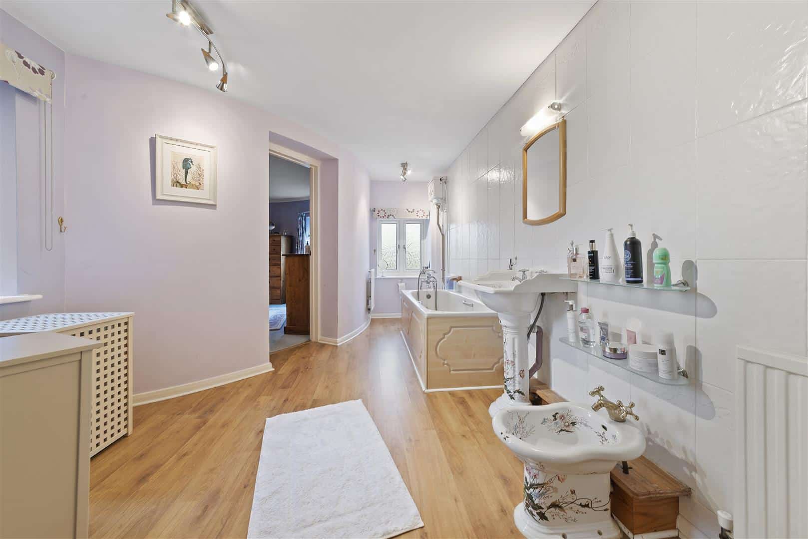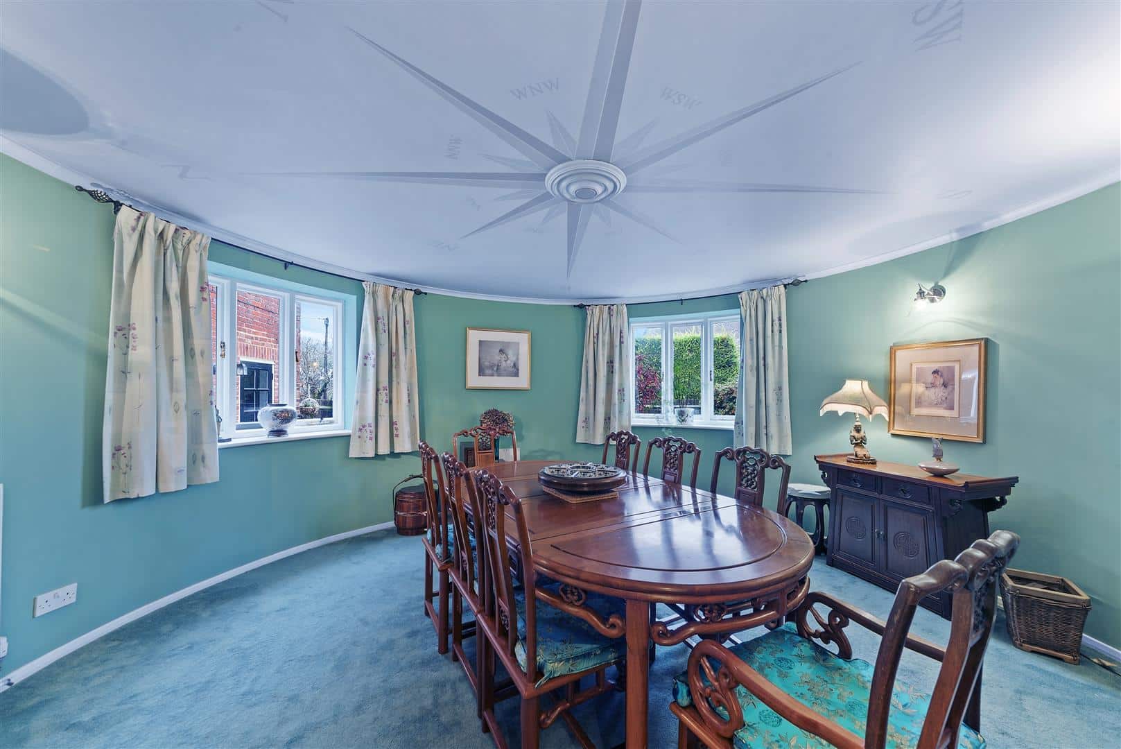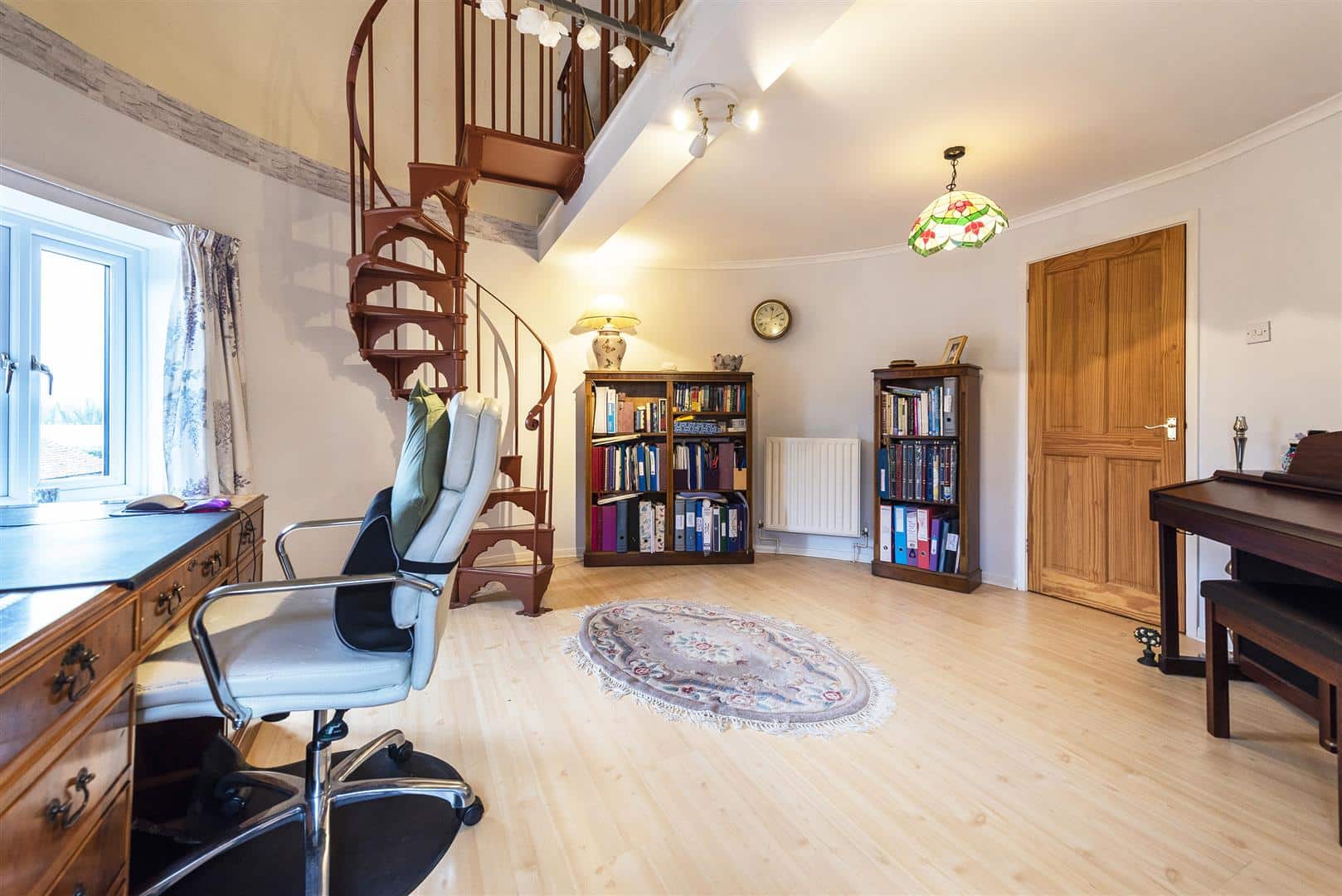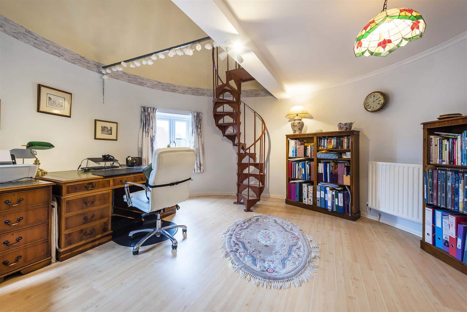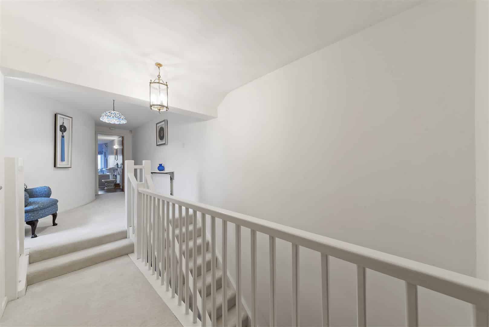 To the first floor there are five bedrooms, two of which benefit from ensuite facilities, along with a well appointed family bathroom. The first roundel bedroom also features a spiral staircase leading to a mezzanine level, making it an ideal teenager’s suite or creative retreat.