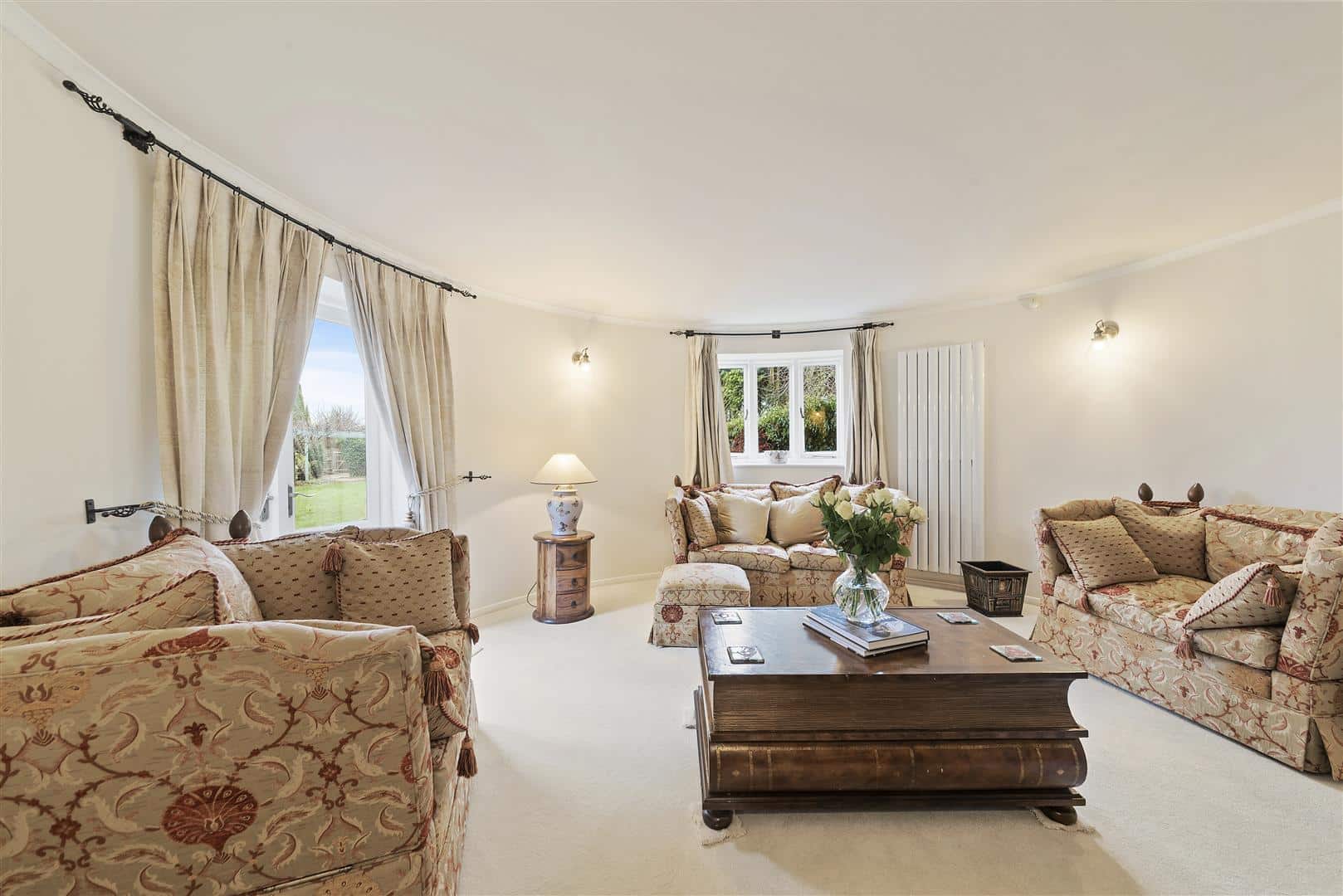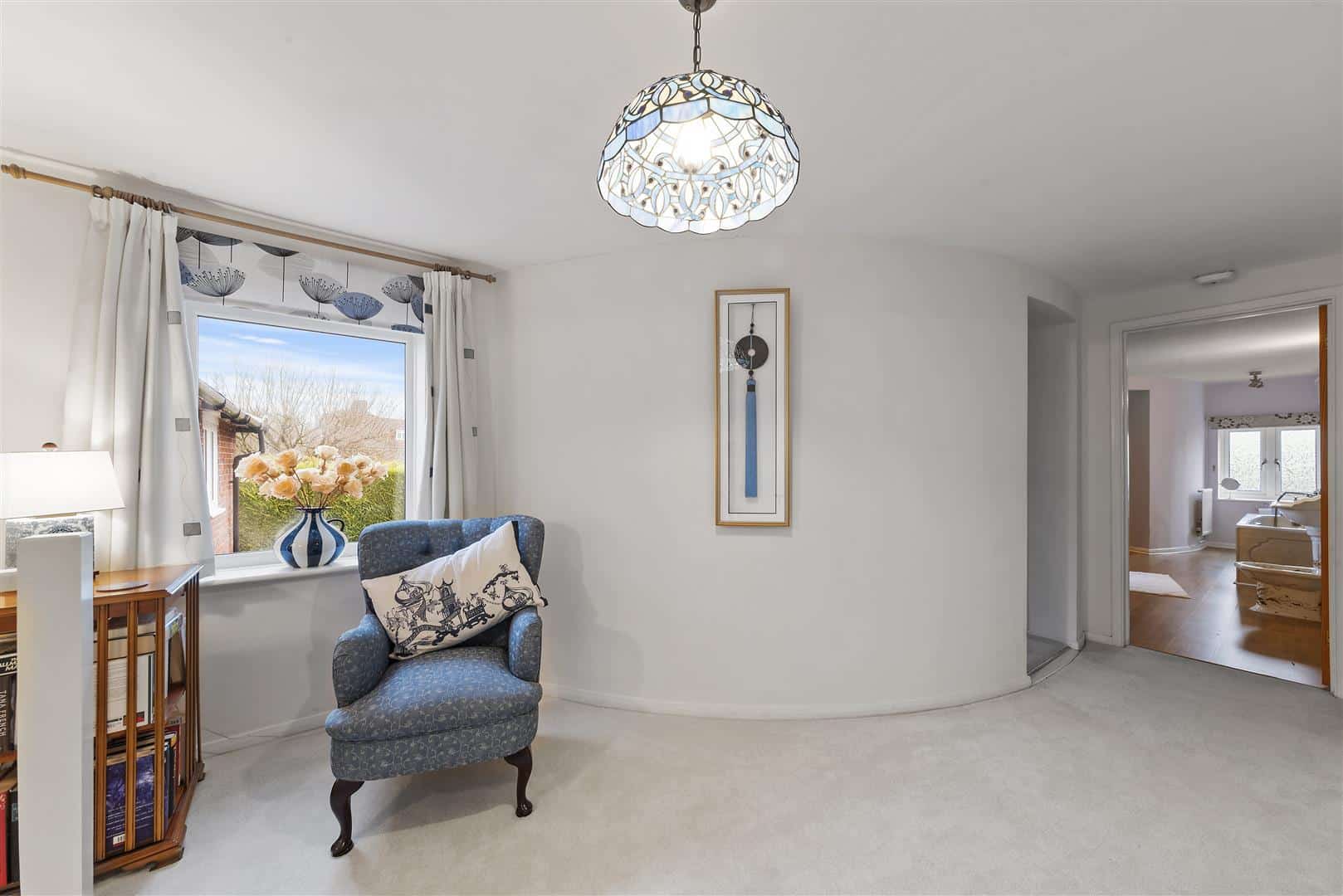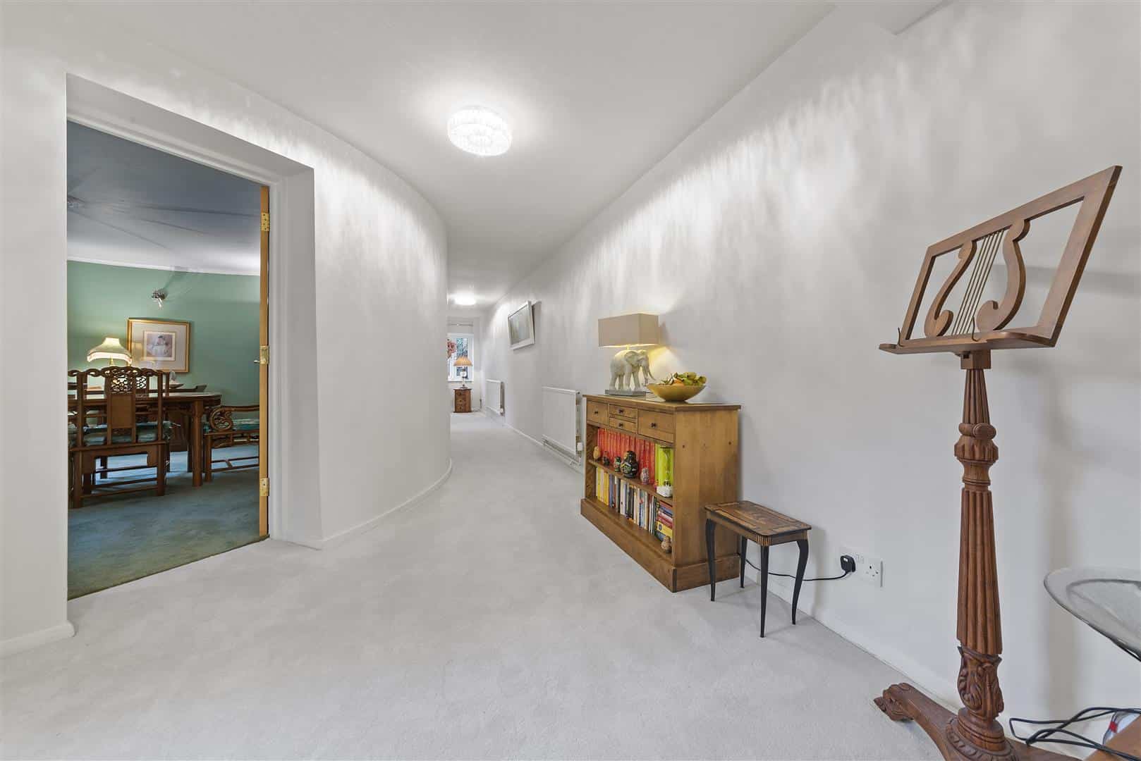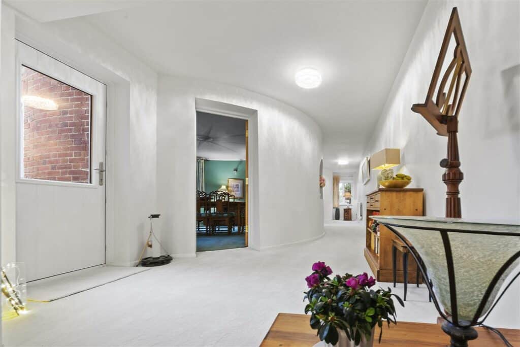 The hallway continues past the first roundel, currently used as a dining room, and leads through to the far roundel which is utilised as a sitting room, creating a wonderful flow through the ground floor. The kitchen is connected to the integral garage, and planning permission has previously been granted to incorporate the front garage into further living accommodation. This offers exciting potential to create a truly stunning kitchen and family room.