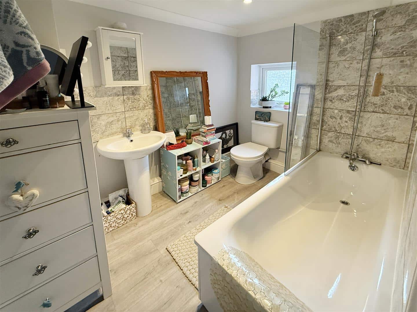 To the first floor there is a generous double bedroom, a well proportioned single bedroom and a newly fitted bathroom comprising a contemporary suite with shower over the bath.