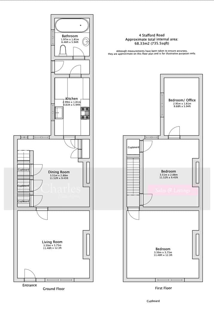 The living room features original wood flooring, a cast iron Georgian style fireplace, and shelving to both alcoves. The dining room also has original wood flooring, spacious under-stairs storage in three separate fitted cabinets, and a large larder.