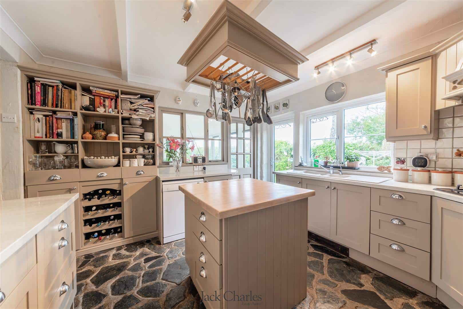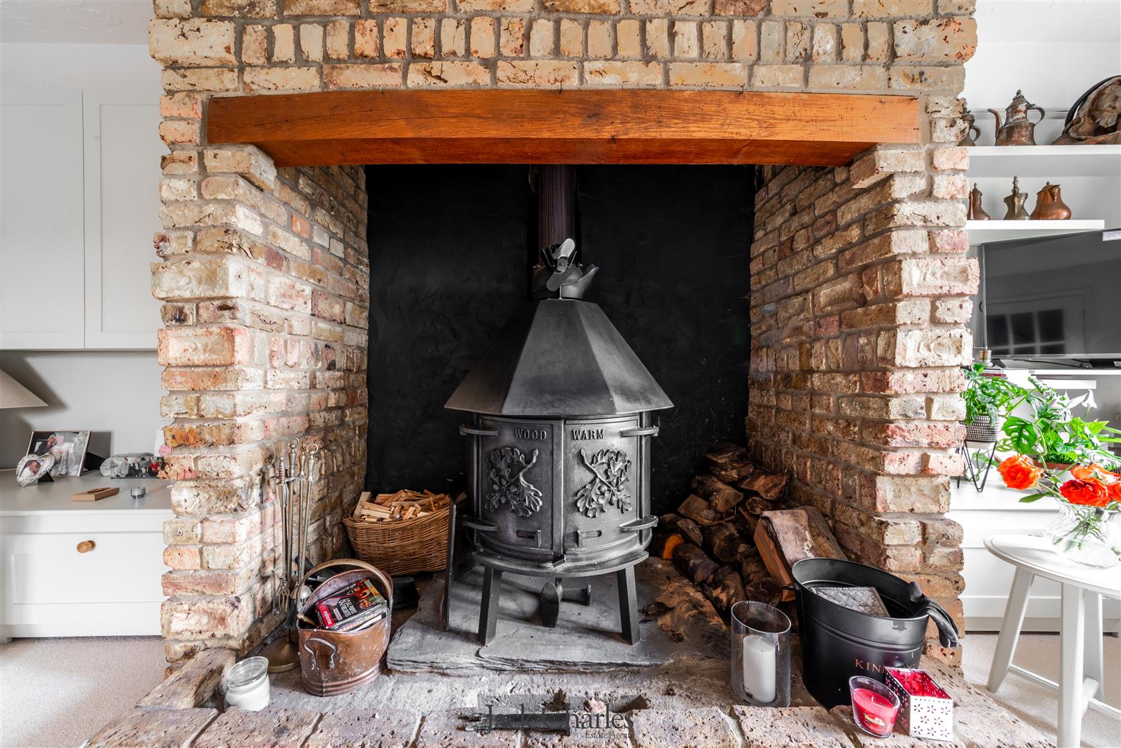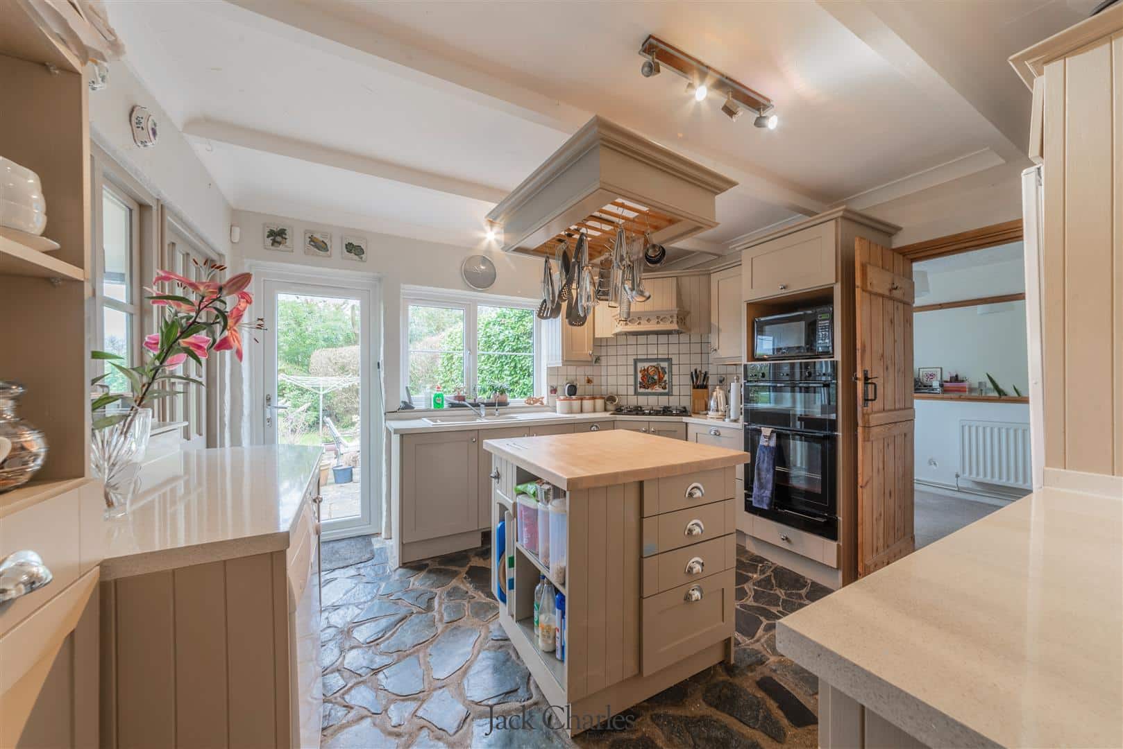The ground floor offers well balanced and versatile living space, including a sitting room with a feature fireplace and wood burning stove, a dining room, and a conservatory with a solid roof and doors opening out to the garden. The conservatory provides access to the terrace, creating an excellent flow between the indoor and outdoor spaces. The country style kitchen is well appointed with a range of units, integrated appliances and a central island, while a study, alternatively bedroom four, offers additional flexibility.