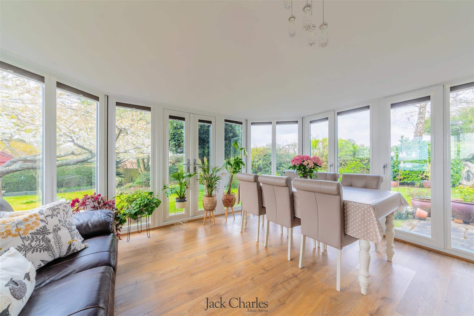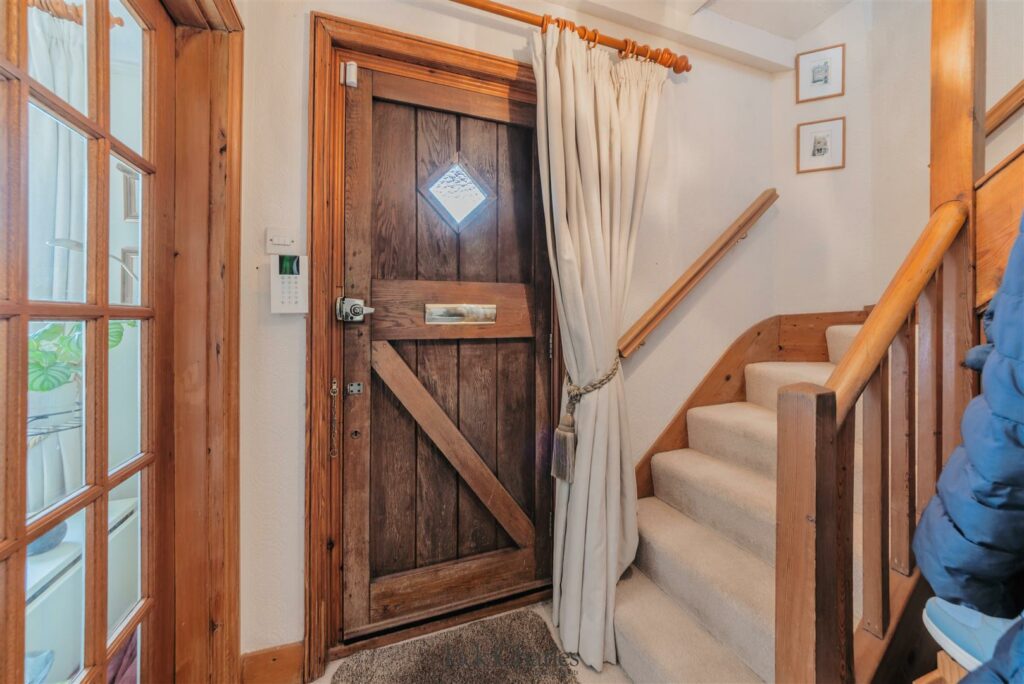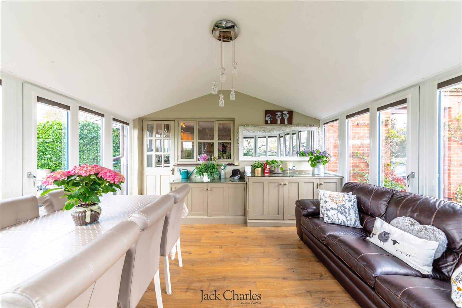 The ground floor offers well balanced and versatile living space, including a sitting room with a feature fireplace and wood burning stove, a dining room, and a conservatory with a solid roof and doors opening out to the garden. The conservatory provides access to the terrace, creating an excellent flow between the indoor and outdoor spaces. The country style kitchen is well appointed with a range of units, integrated appliances and a central island, while a study, alternatively bedroom four, offers additional flexibility.