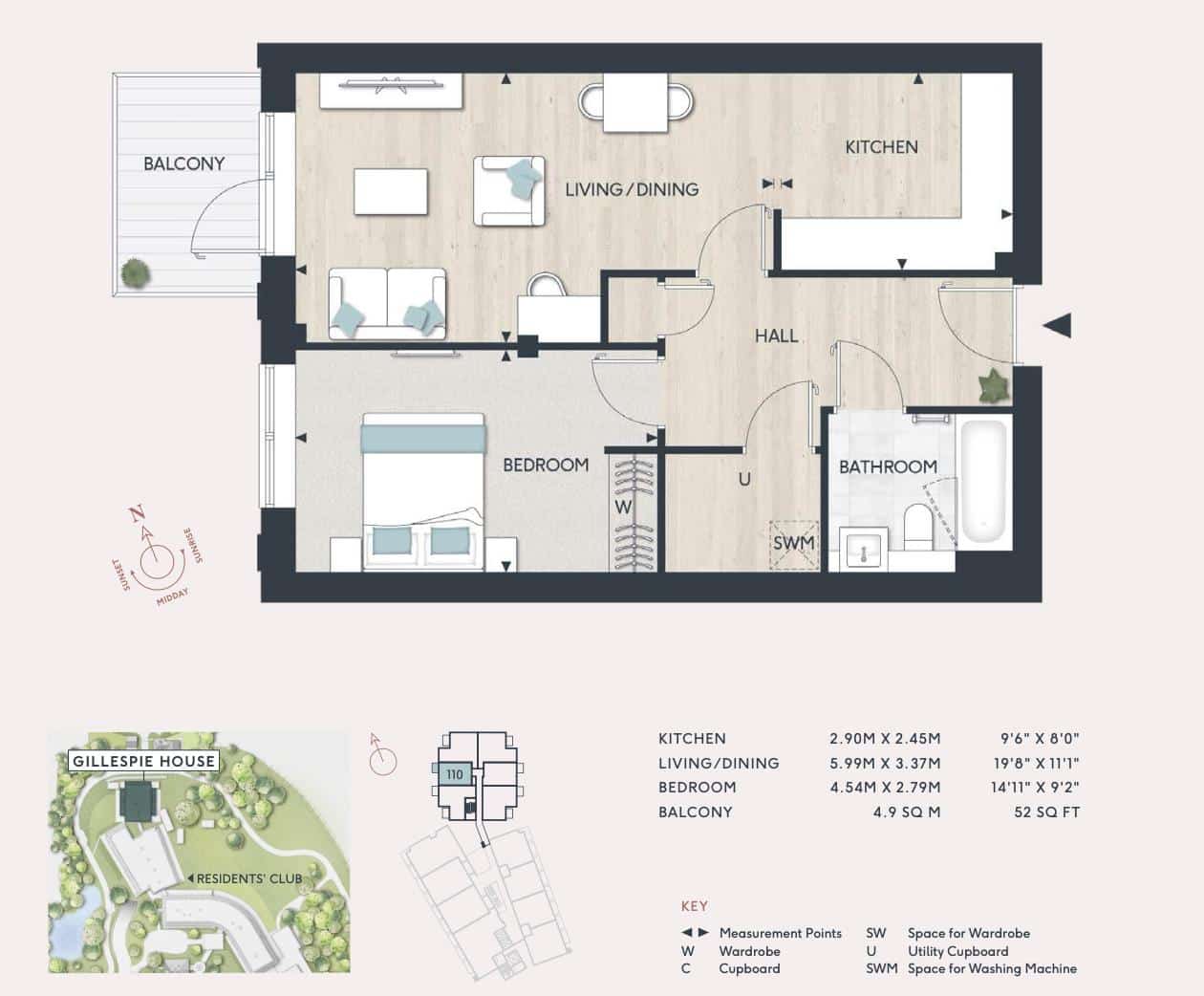 A well-appointed and stylish one-bedroom apartment situated in Gillespie House, adjacent to a 13-acre country park. This first-floor apartment features a spacious layout, including an entrance hall with a utility cupboard, a bedroom with an ensuite and built-in wardrobes, a family bathroom, and an open-plan kitchen/dining/living area that opens onto a southeast-facing balcony.