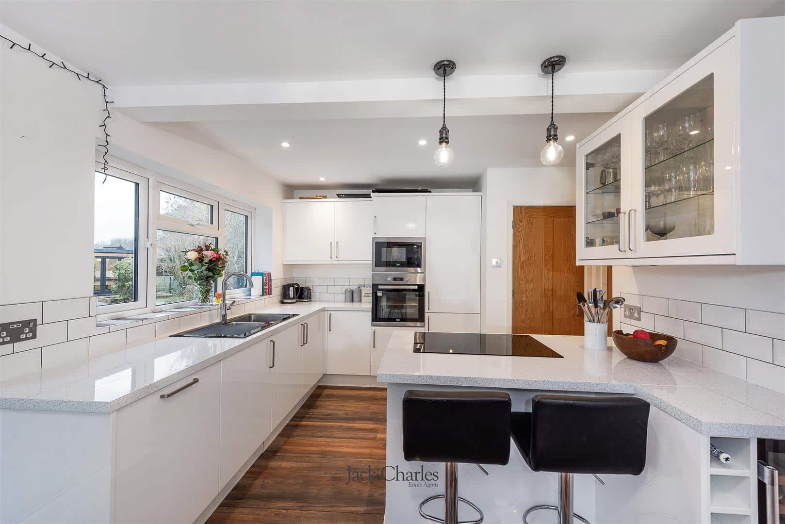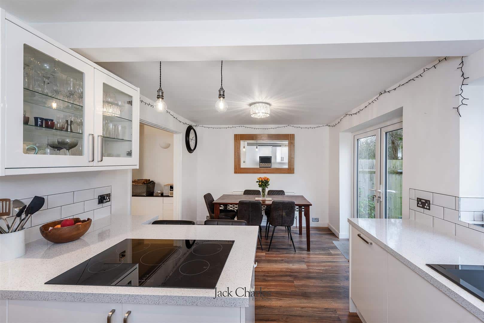 The living room enjoys a lovely aspect over the front and features a wood burning stove, creating a warm and inviting space. A square archway leads through to a beautiful kitchen dining room which provides space for a table and chairs as well as an extensive range of units including cupboards and drawers, a wine fridge, integrated appliances and a sink. Patio doors open out to the rear garden and there is also a picture window overlooking the garden. A door from the kitchen leads to a cloakroom WC with a window and a wash hand basin.